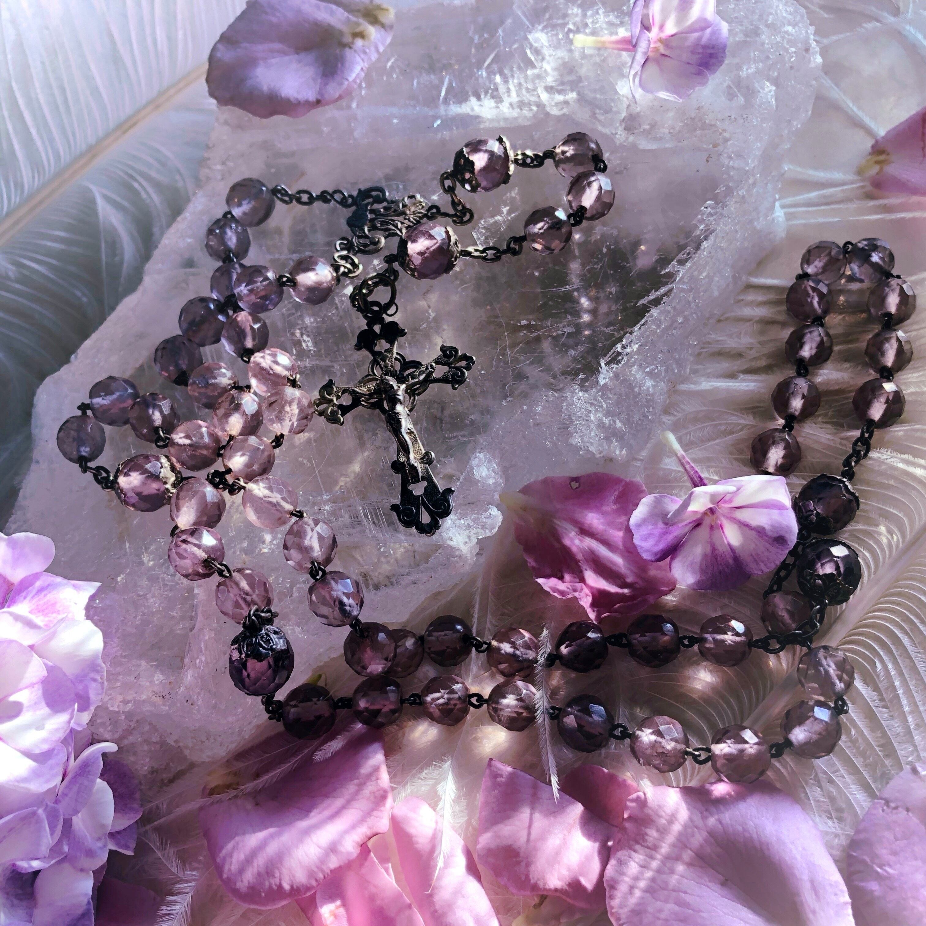 綺麗な薄紫、爽やかなガラスをあしらったロザリオです。しかし、手にした感じは、案に相違して実にどっしりとしています。大きさの違う球を組み合わせたチェーン、クロスも、途中に配置したアヴェ・マリアを表すプレートも繊細で丁寧な造りです。クロスとプレートは表裏ともにきちんと造り込まれています。