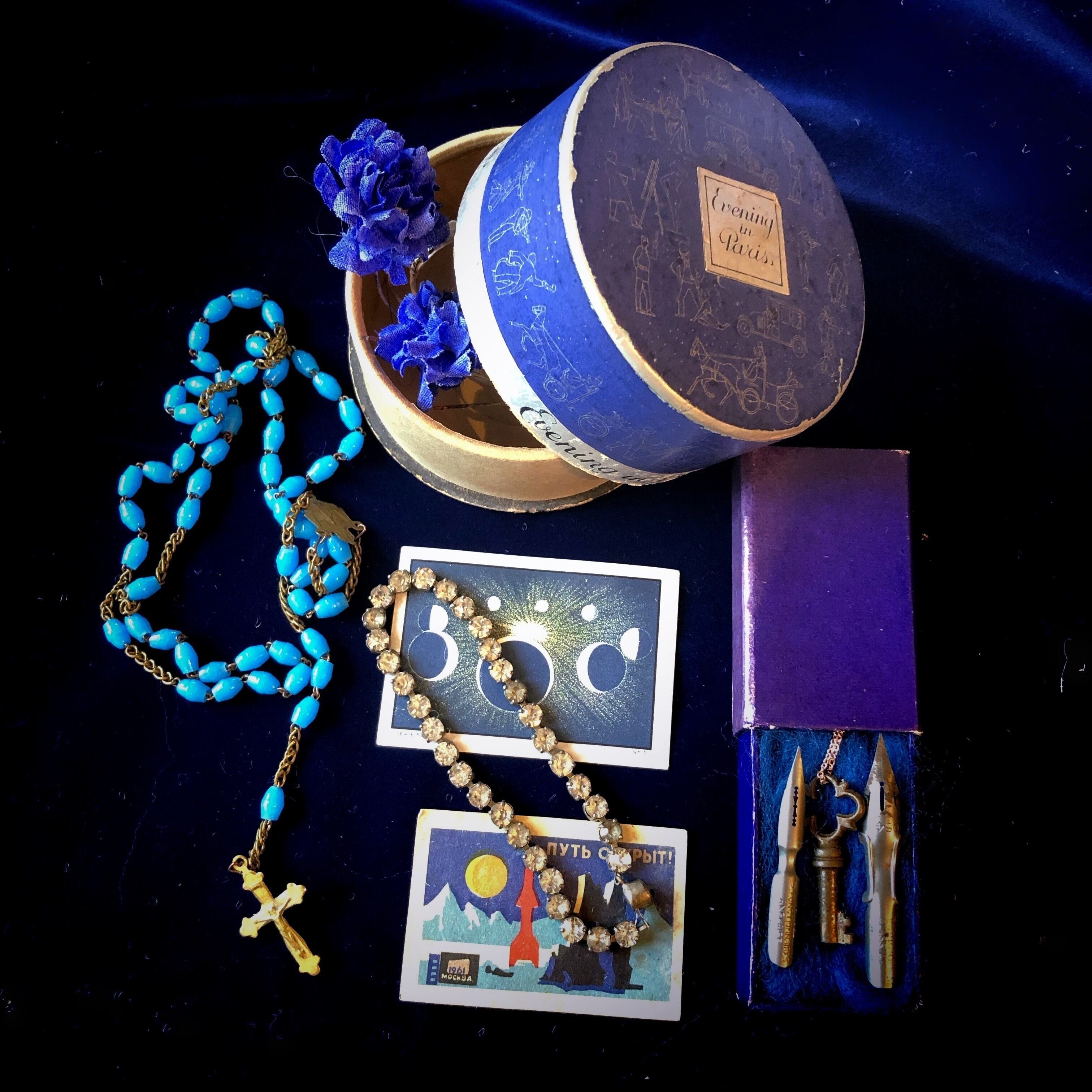 パリの夜景が描かれた古いパウダーボックスに様々な古いものを詰め合わせてみました。こちらはアクセサリーがメインで、ロザリオ、古い鍵のペンダント、ブレスレット等が入っています。お値段の倍以上の内容でお買い得です。
