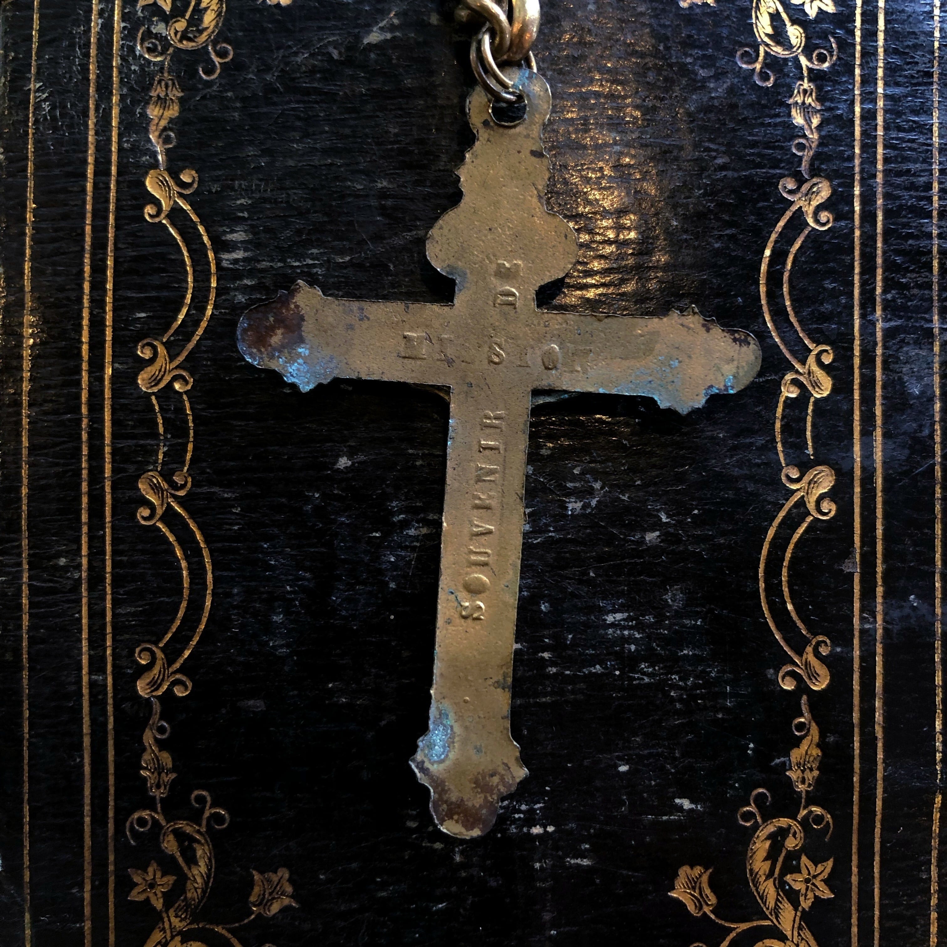 古い十字架です。少し緑青も浮いて、この十字架に流れた長い時を感じさせます。裏に「〜の記念」というフランス語と地名が書いてあるのですが、地名の部分が完全には判読できません。どこかへお参りをした、巡礼に行った、そういう記念に求めたものなのでしょう。