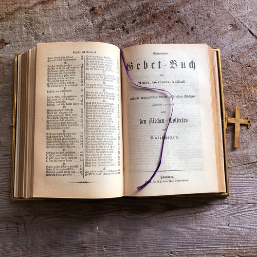 実は、フラクトゥールという書体で書かれた古いドイツ語が、ほとんど読めません。教会などという単語が出てくるようで、途中に「祈りの本」と記された扉もあるので祈祷書ではないかと推測しています。