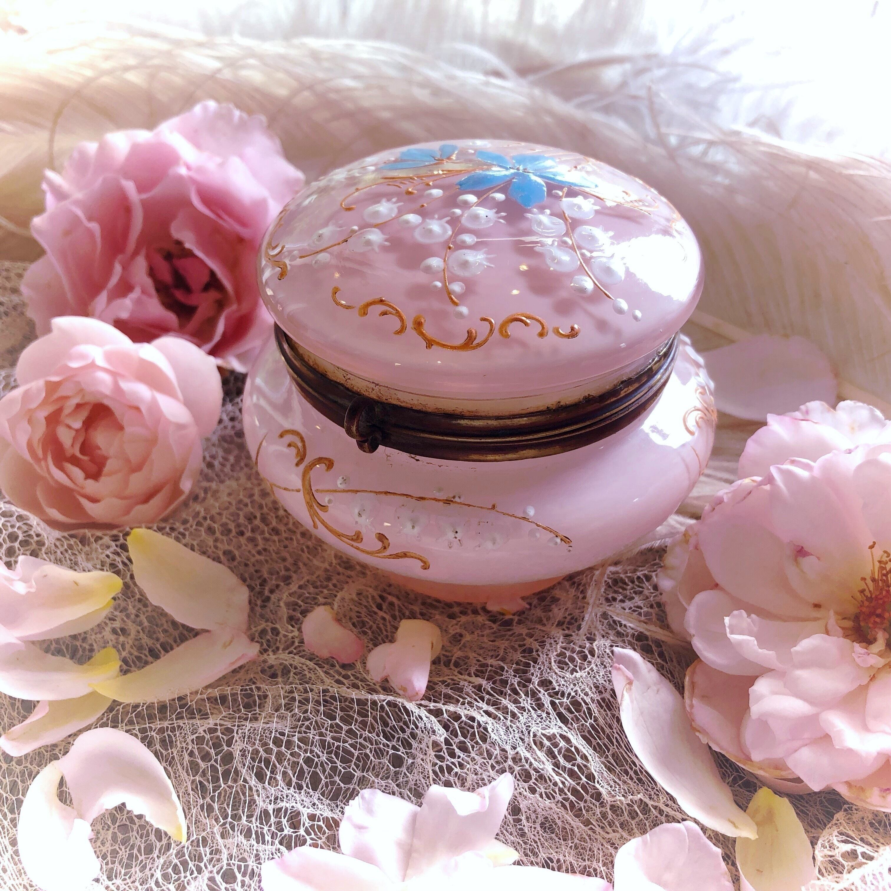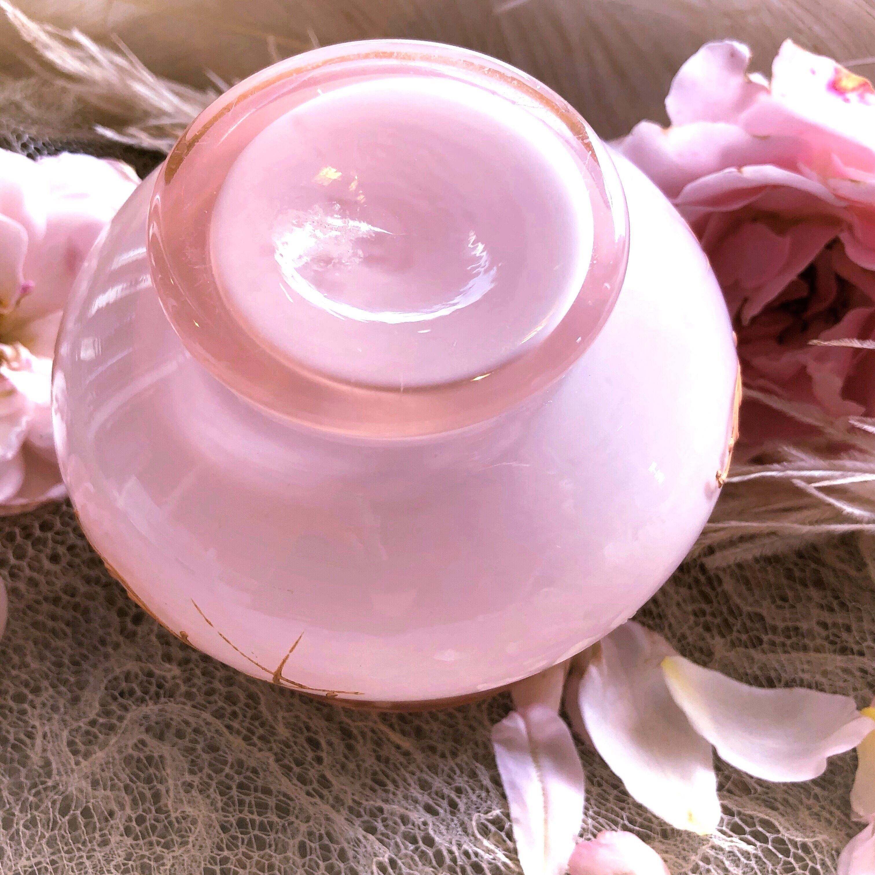 スミレとスズランのボンボニエールはいかがでしょう。この夢見るようなミルキーピンクは、内側が半透明の白ガラス、外側がピンクの透明なガラスの2層構造になっています。その為、エナメルで描かれた模様が柔らかい影を落とし、軽やかな浮遊感を醸しています。真鍮の留め具も年を経てよい感じです。