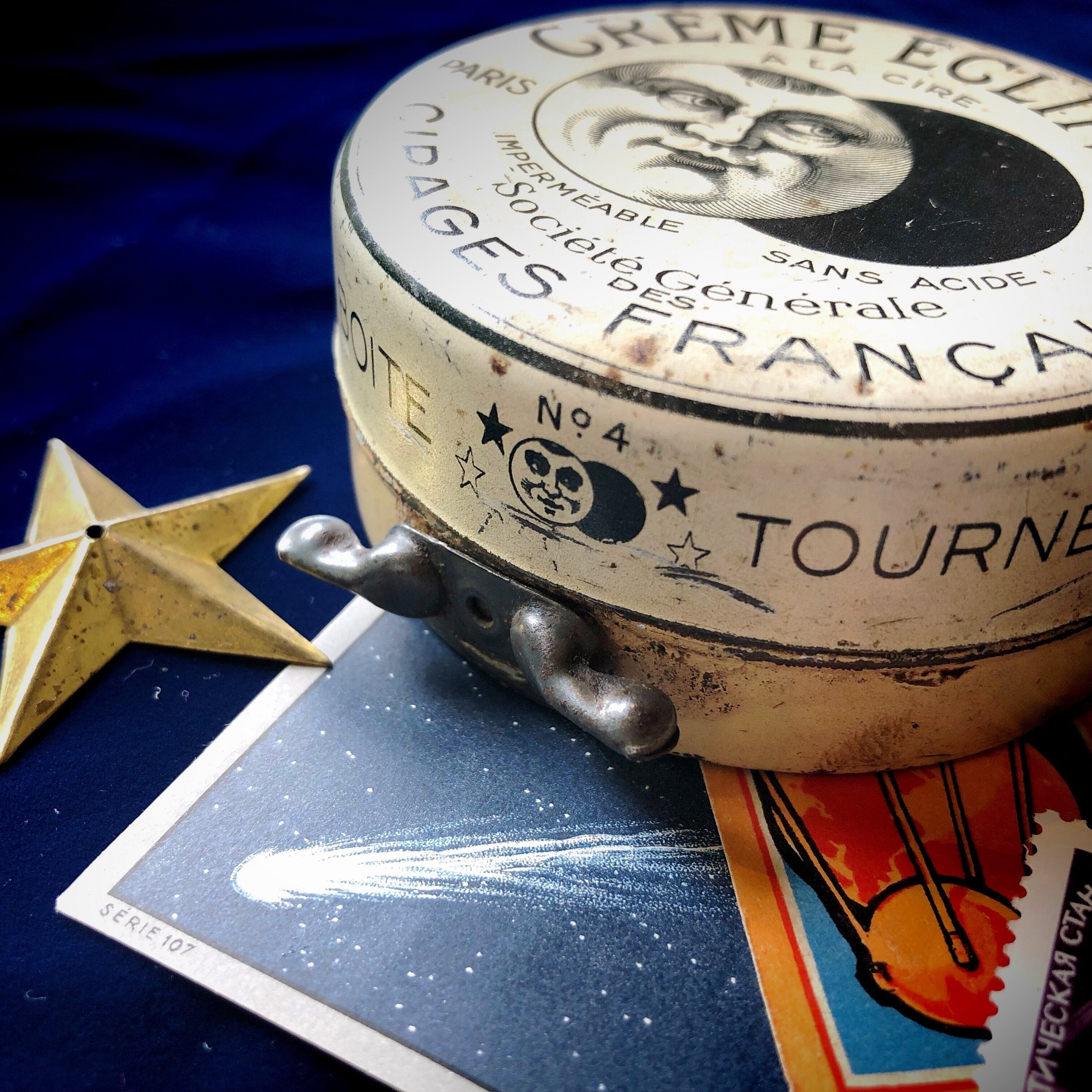 フランス製のお月様マークのティン缶はいかがでしょう。中身は時代も国もバラバラですが、天文系カードや宇宙バッジなど、理科趣味、少年趣味なものを色々入れてみました、写真を撮った後、まだ隙間があるので、入るだけ色々詰めましたので、それは届いてからのお楽しみ。