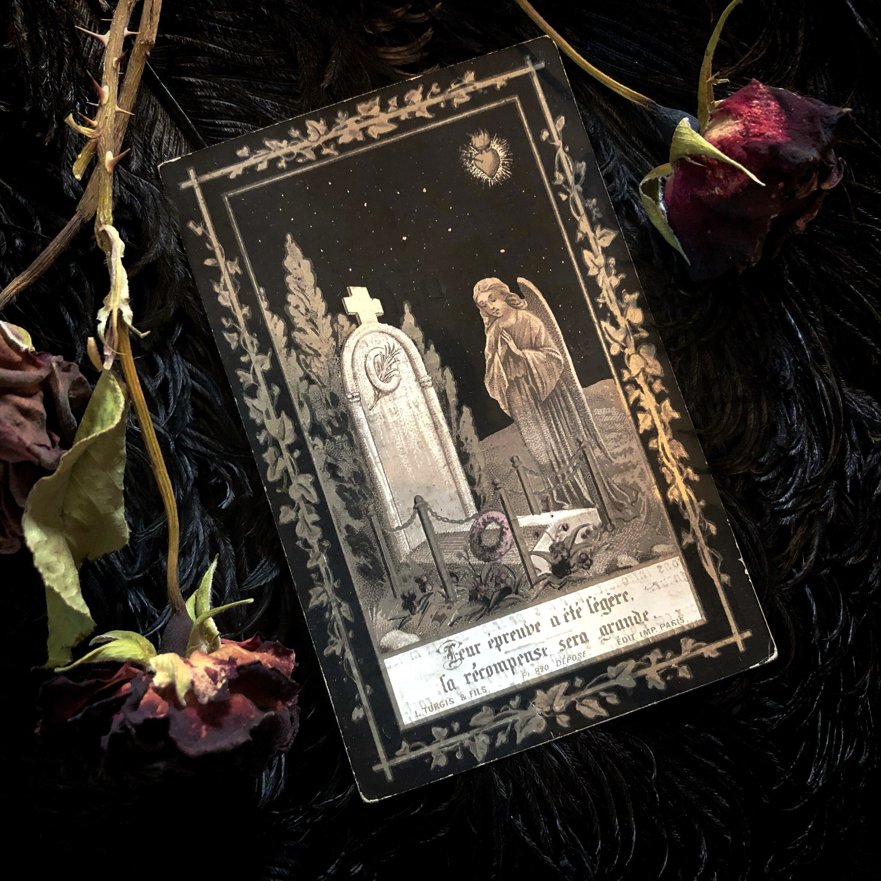 デスカードは亡くなった方のお葬式などで配られるカードで、裏にはその人の名前や生年月日、どのような人柄であったのかの説明、それとお祈りの言葉などが書かれています。意匠も様々で、静謐で厳かで美しいものです。