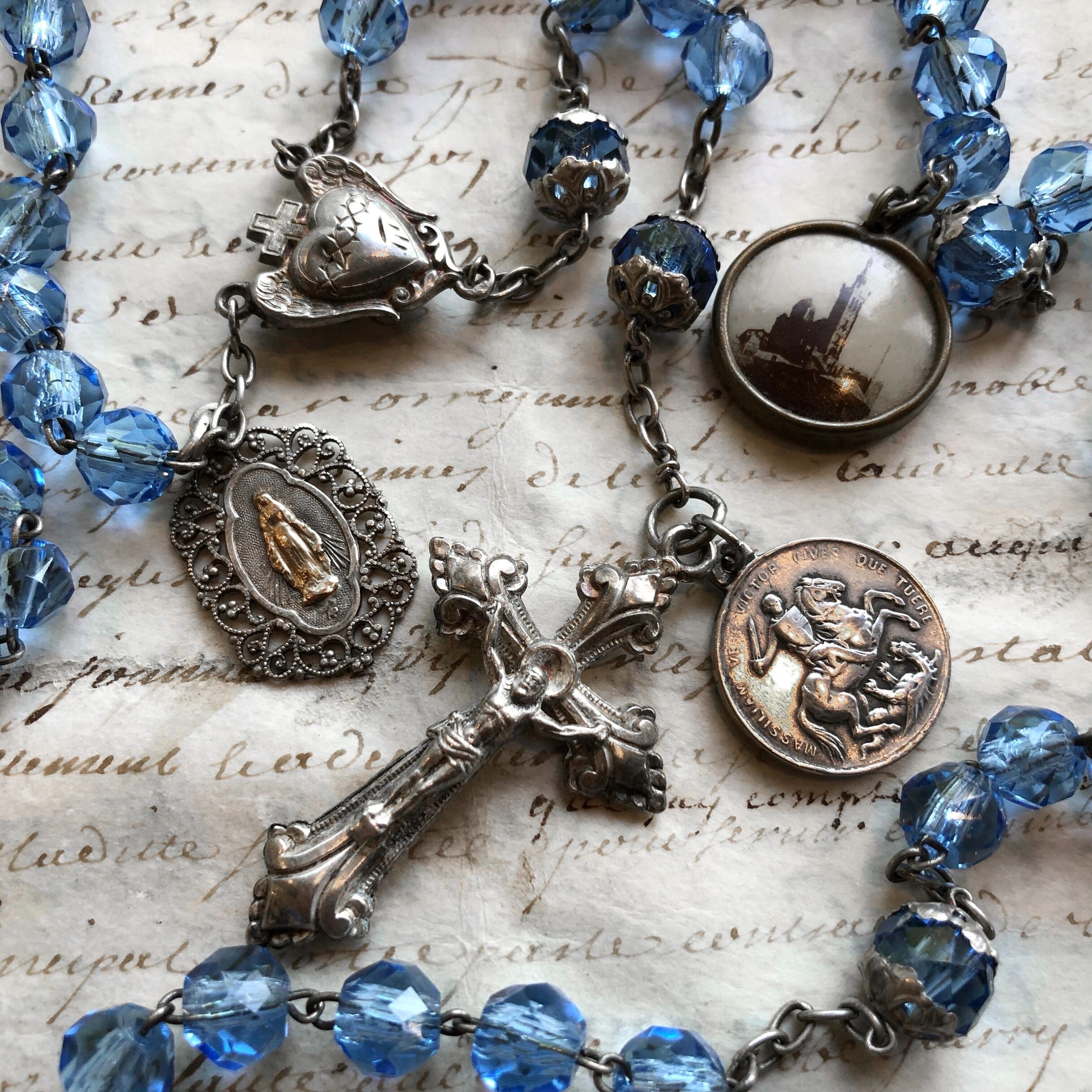 凝った造りのクロスにイエスの聖心を表すハートのプレート、綺麗な水色のガラスビーズをあしらったロザリオです。このロザリオには更に、後で加えられたと思われる3つのものがついています。