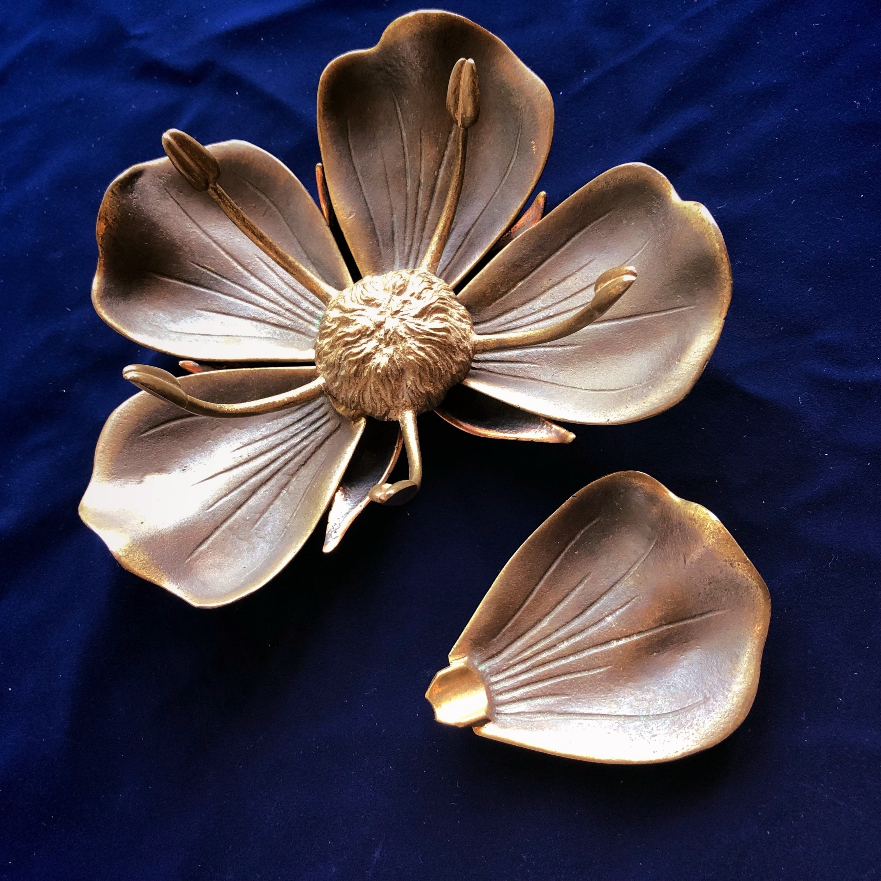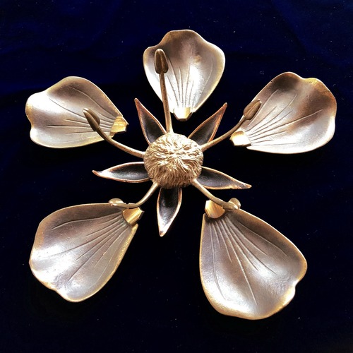 古びた金属の質感が素敵な花のオブジェですが、実はこれは花弁がとれてトレイになるのです。かつては銘々が灰皿として使うようにお客様に配ったものなのでしょう。刑事コロンボなどの1970年代のドラマを見ると、とにかく全ての登場人物がタバコを吸いますよね。その頃は便利だったのでしょう。今は、ひとつだけとってアクセサリー置きにして、あとはオブジェとするなど、実用にも装飾にも楽しみ方は様々です。