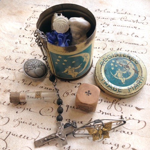 三日月に乗ったピエロのティン缶はいかがでしょう。中身は時代も国もバラバラですが、古い鍵のペンダント、金属の蝶のブローチ、アンティークボタン、ドイツの人形工場敷地から掘り出されたダメージドールなど、色々入れてみました、そして、まだ隙間があるので、入るだけ色々詰めました。それは届いてからのお楽しみ。