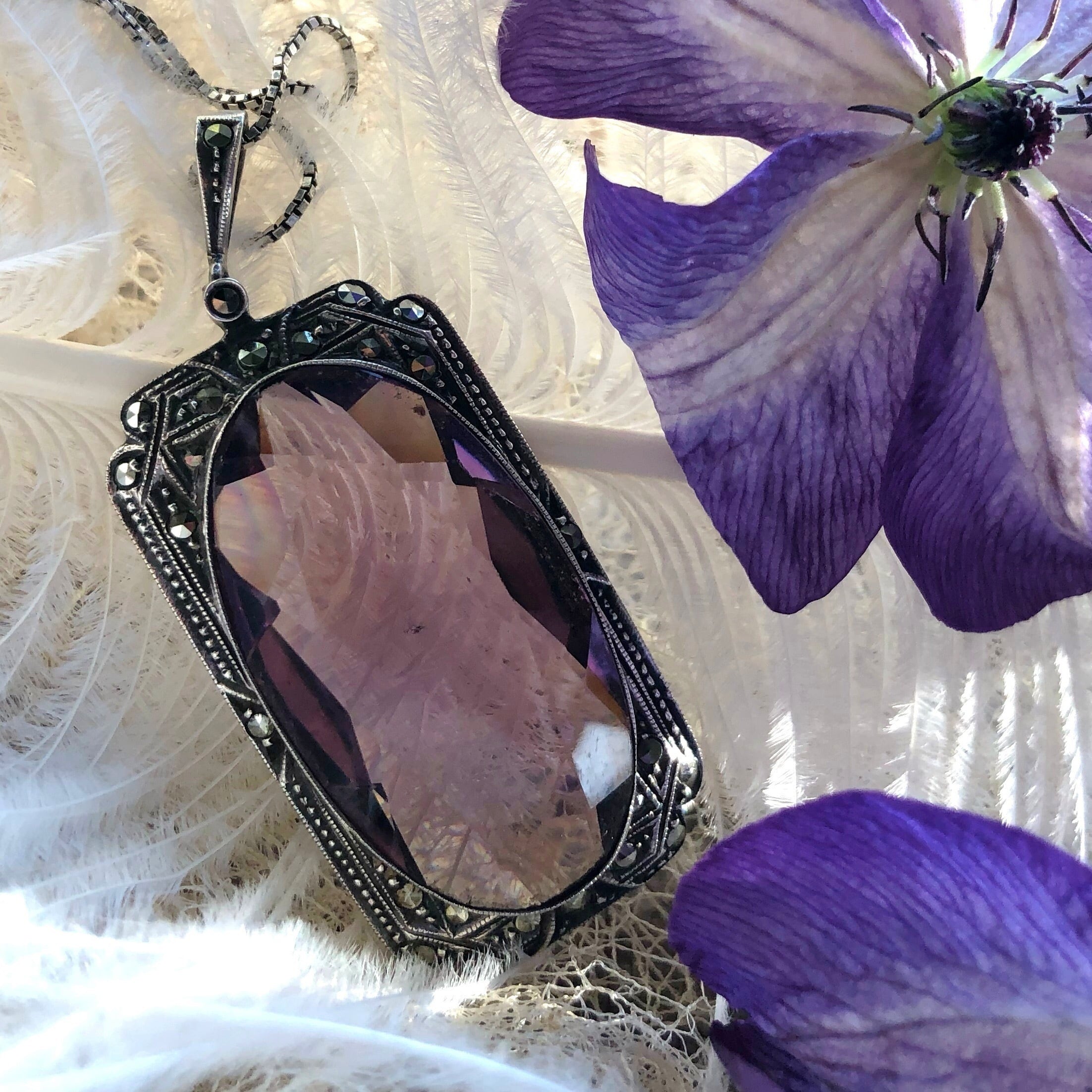 アメジスト色のカットガラスと、周囲に小粒のマーカサイトを配したペンダントです。カットガラスが固定されているボックスはスターリングシルバーで細かい模様が施された凝った造りです。