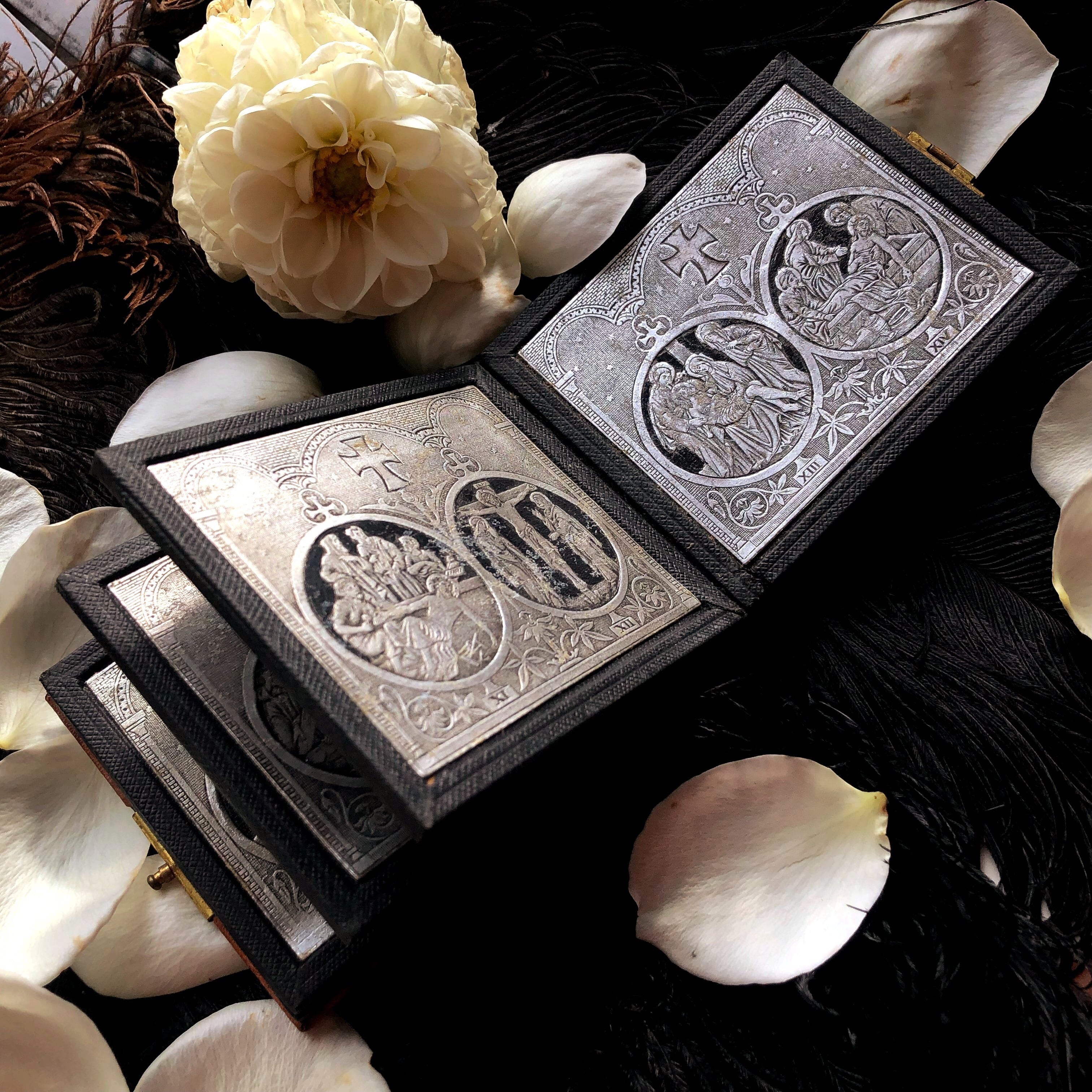 キリストが捕らえられ、十字架にかかるまでを14枚の絵で表しています。扉には金属のキリスト像があり、絵は厚い銀の紙に細かくエンボスを施し、黒く彩色したもののようです。