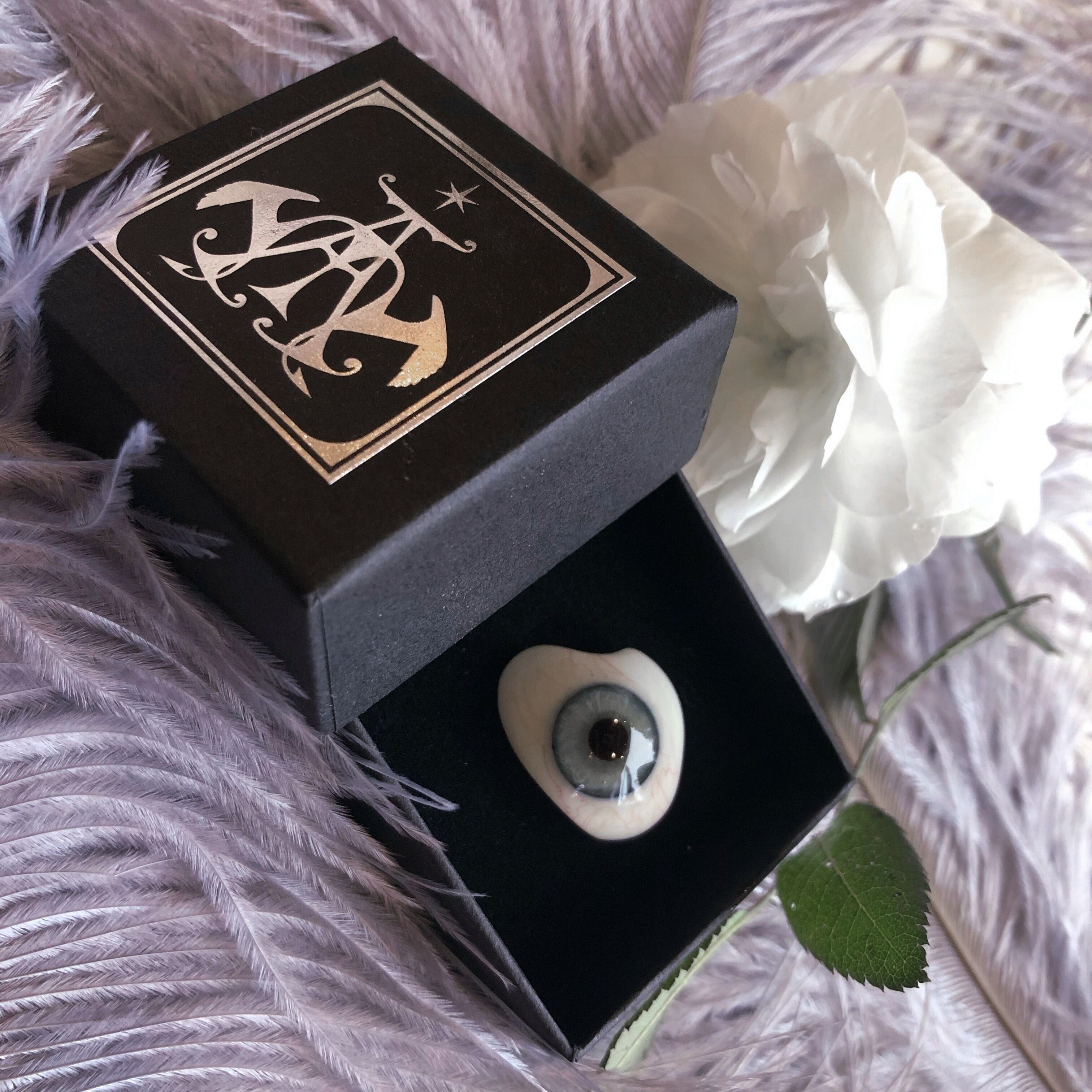 ドイツ製、製作は19世紀末から20世紀初頭です。今回、箱作家さんによる手作りの義眼専用箱が品切れのため、弊店の別のデザインの紙箱に入れてお届けします。そのため、品物はこれまでと同様のものですが、お値段をお引きしてあります。箱は一辺約4.5センチですので、サイズの目安にしてください。