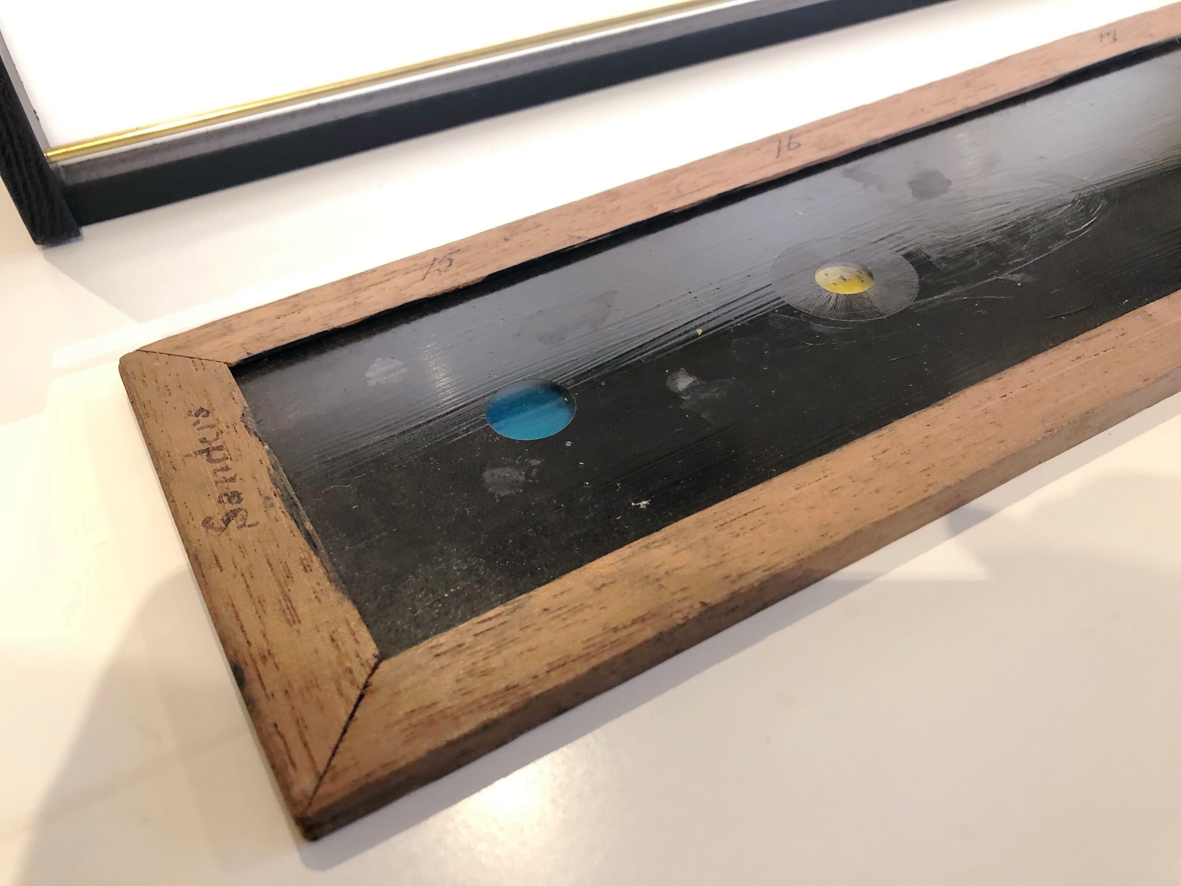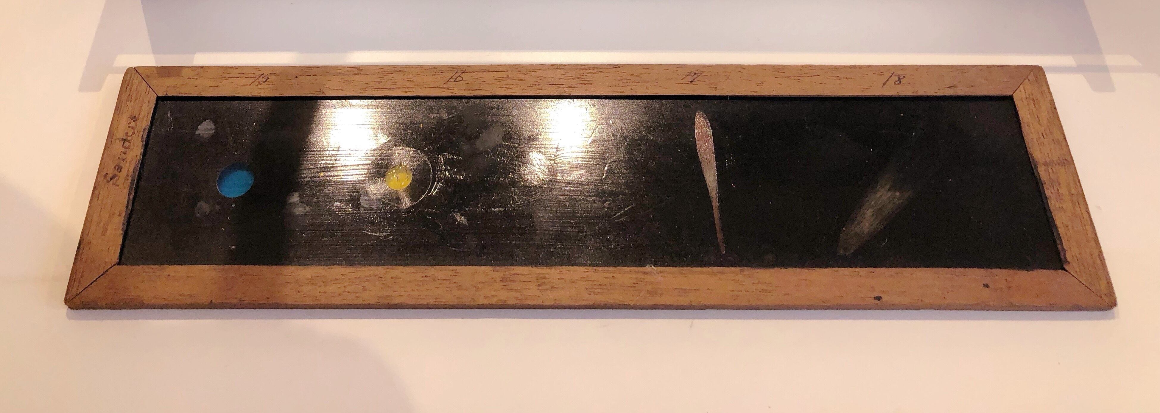 こちらのスライドは、一番左に青く輝く地球と彗星が本当に細かく描かれ、次に彗星の軌道、そして当時スケッチされた彗星が描かれています。拡大投影を前提にして製作されたため、地球も彗星も「一生懸命に」と言いたくなるような描かれ方ですが、このような手作りの天文系幻灯機スライドは大変珍しいお品と言えます。