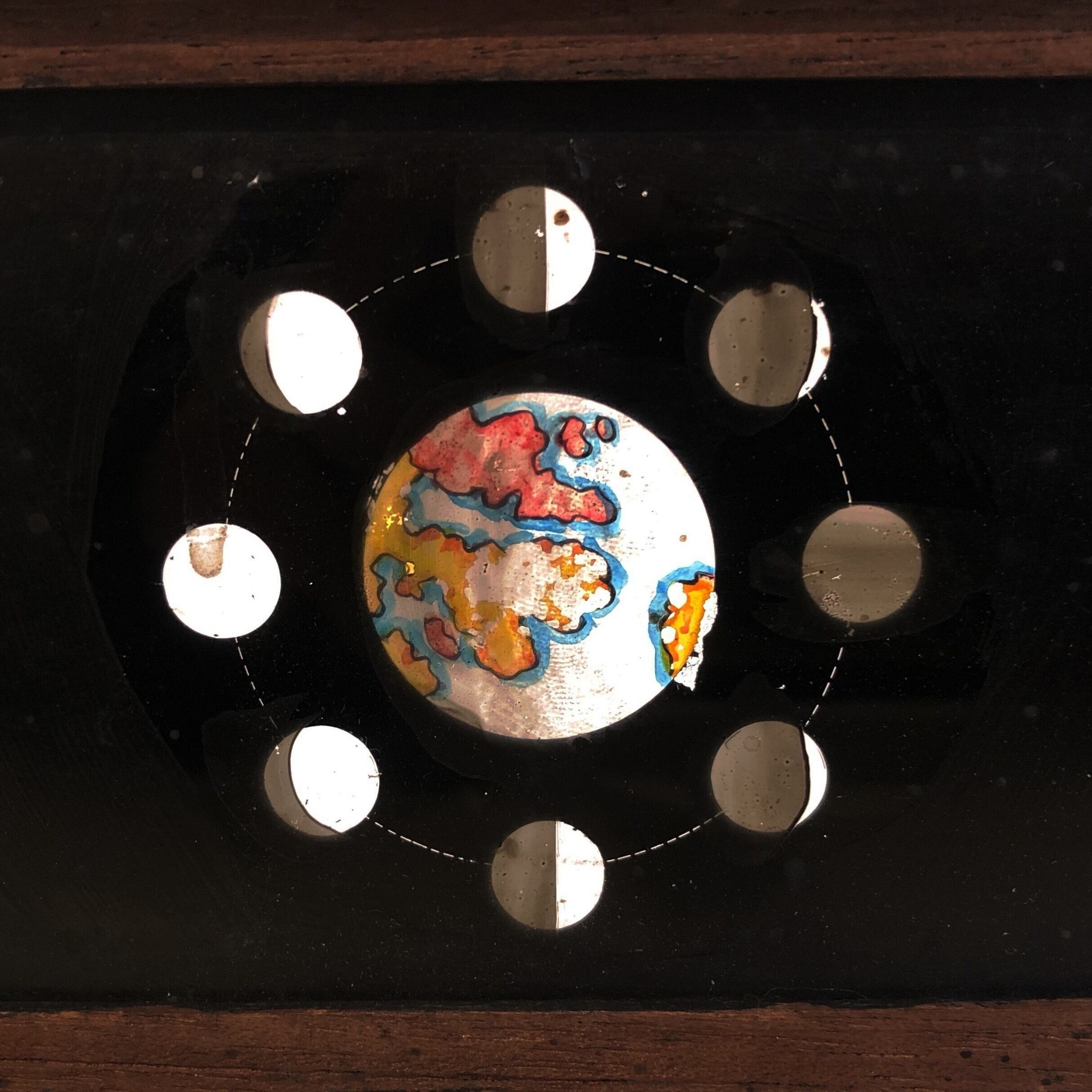 こちらのスライドは、まず月の満ち欠けを描き、さらに満月、半月、新月を描いています。黒く塗られたガラスに浮かび上がる月は、心を惹かれるよい雰囲気です。19世紀当時、月面写真は既にあったのですが、解像度が低く、スライドには使えなかったようです。そこで、拡大投影を前提に手描きすることになり、地球も月面も「一生懸命に」と言いたくなるような描かれ方ですが、このような手作りの天文系幻灯機スライドは大変珍しいお品と言えます。