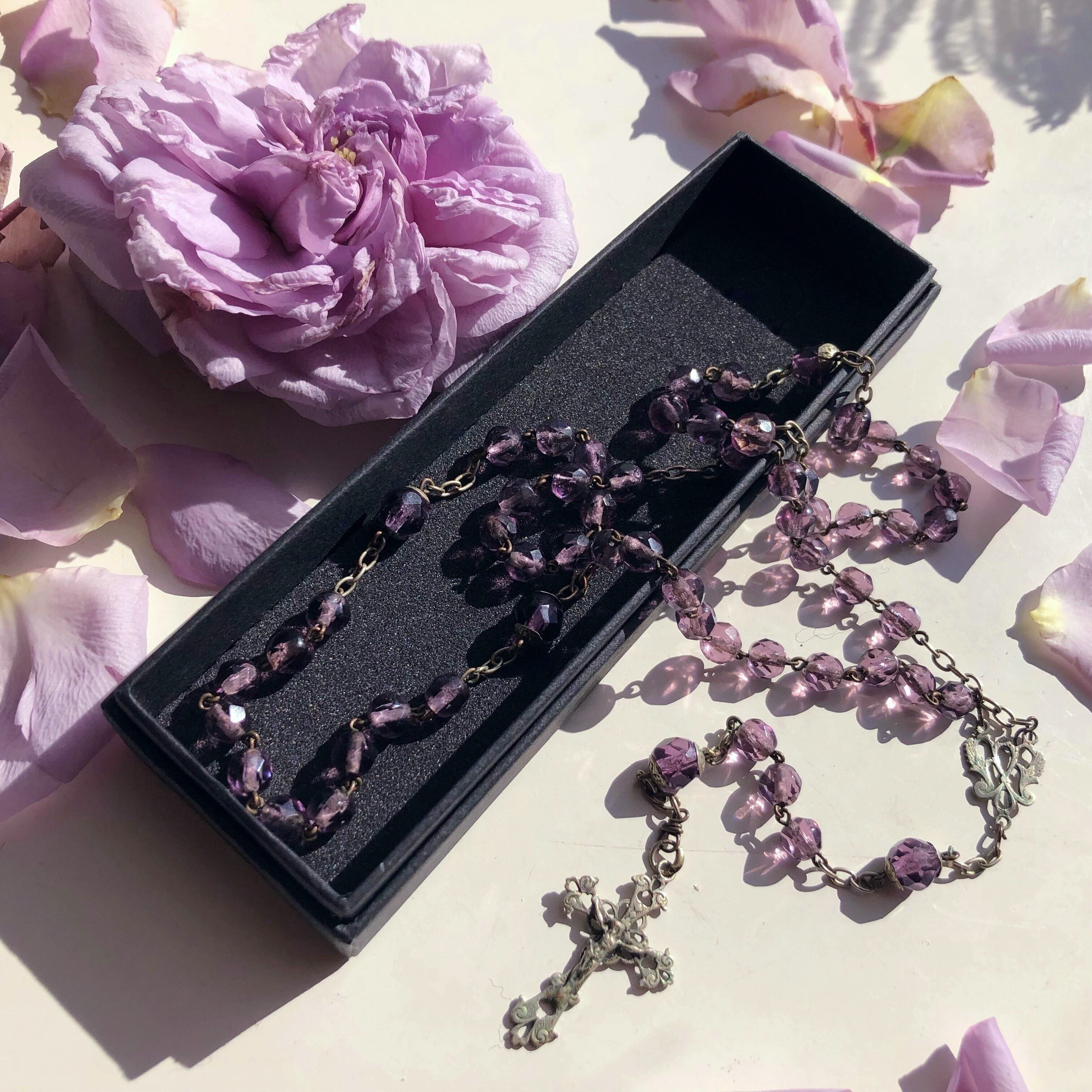 綺麗な薄紫、爽やかなガラスをあしらったロザリオです。綺麗にカットされた大きさの違う球を組み合わせたチェーン、クロスも、途中に配置したアヴェ・マリアを表すプレートも繊細で丁寧な造りです。クロスとプレートは表裏ともにきちんと造り込まれています。