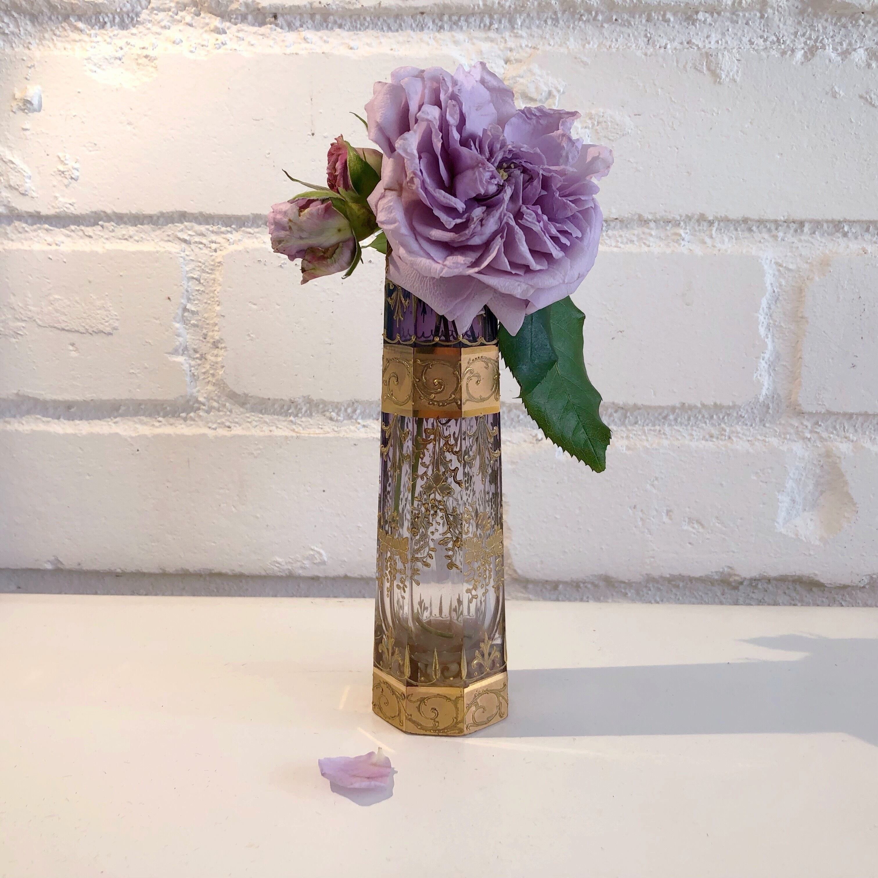 厚手のどっしりとしたクリスタルガラスに、盛られた金彩で繊細な模様が描かれ、一部は金色に塗られた上に、さらに金彩の実に細やかな表現が見られます。さらにガラスの上部3分の1は紫色、下部3分の2は透明の凝った造りになっています。
