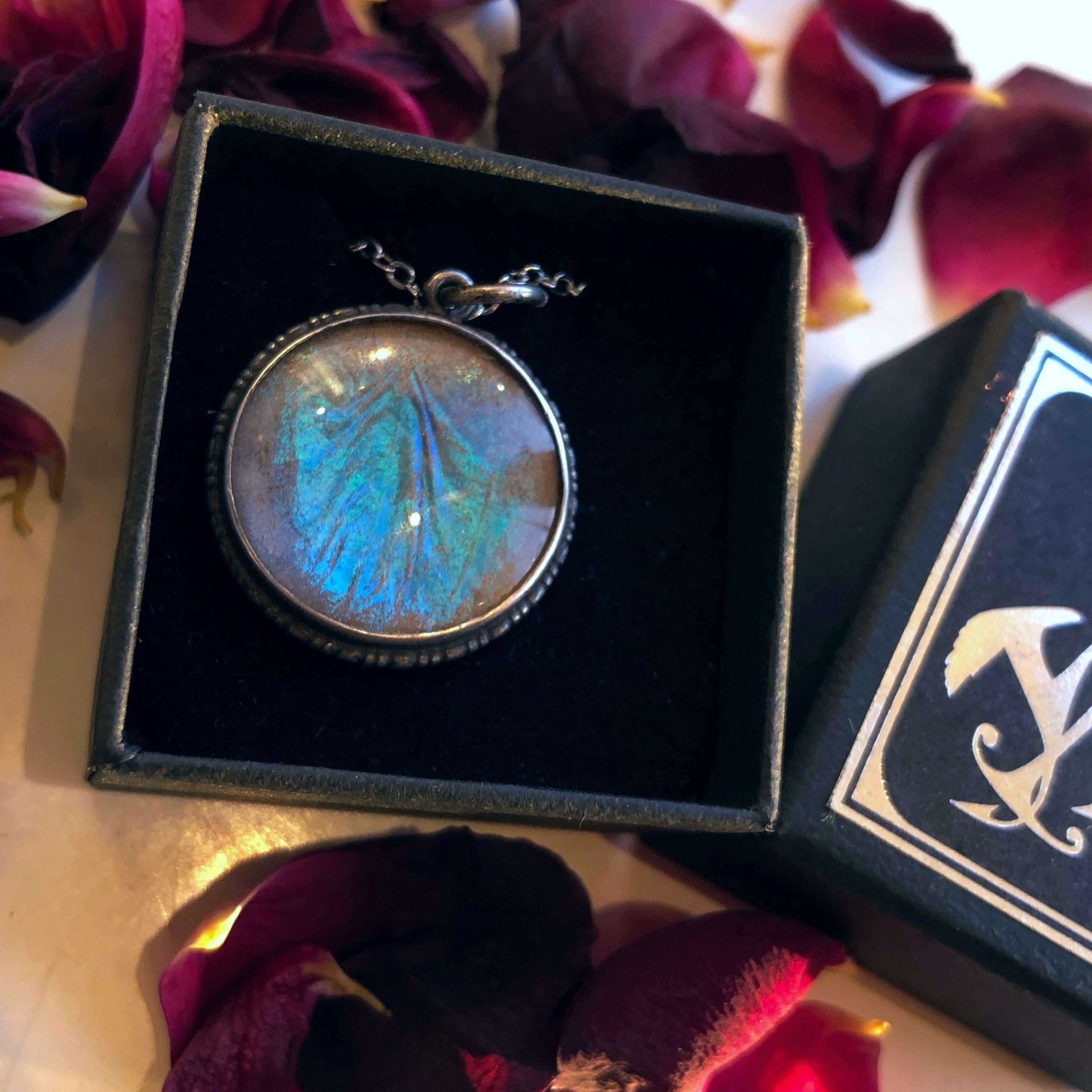 丸型のモルフォ蝶のペンダントです。こちらはアールデコ時代にイギリスで流行したもので、本物のモルフォ蝶の羽が使われています。この輝く青は色素ではなく構造色で、CDが虹色に輝くのと同じ原理です。そのため、角度や光線の加減で色味が変化しますが、こちらのお品は、深い青紫から軽いミントグリーンまで、角度によって様々な様相を見せてくれます。もちろん蝶の羽にあるすじ状の模様も現れます。