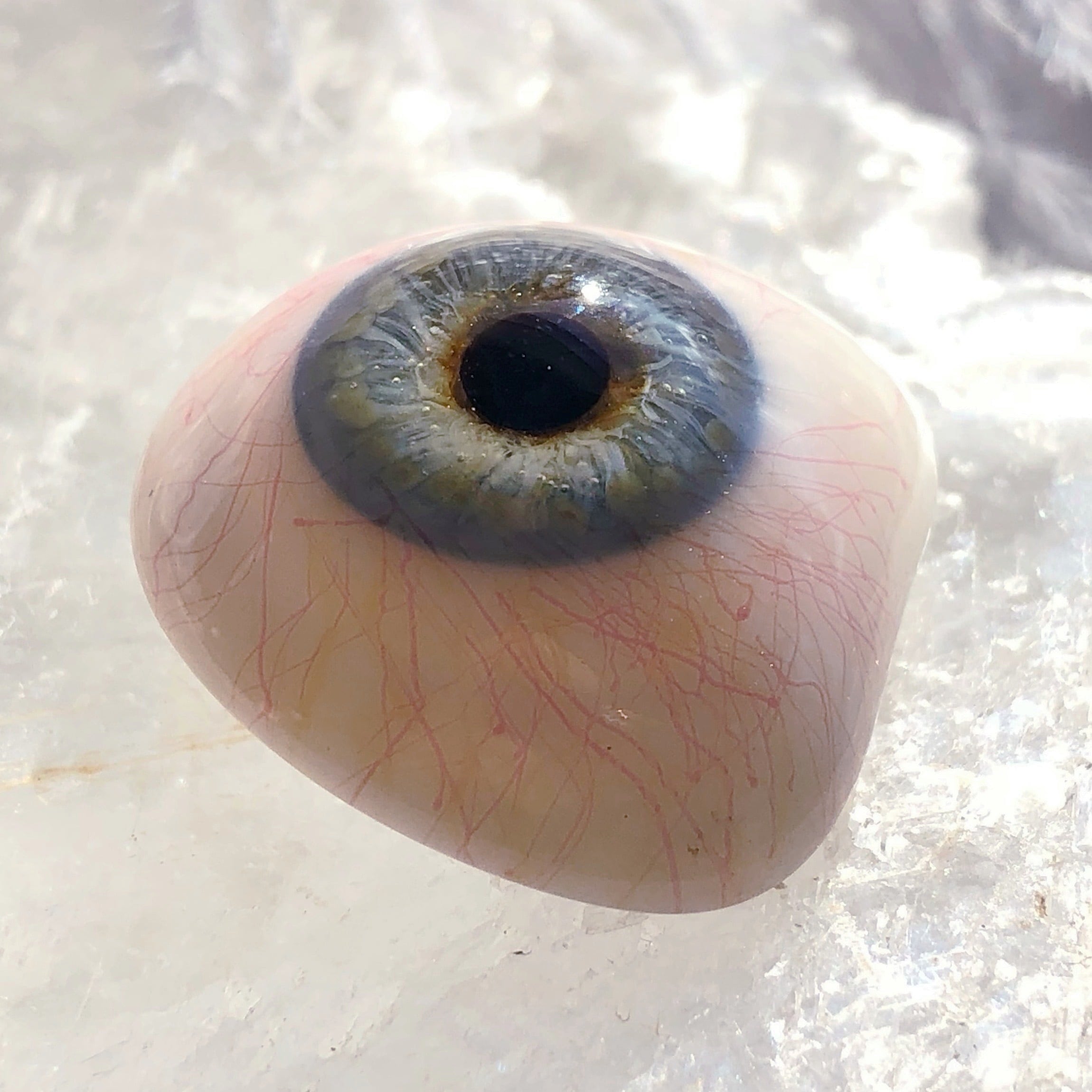 このお品の第一印象は、何と言ってもガラスに満たされた溢れんばかりの光でしょう。その光の底に白い線がうねり、クリームイエローの点が周囲を取り囲んでいます。黒目からは黒みを帯びたオレンジがわずかに滲み、さらなる深みを暗示しています。