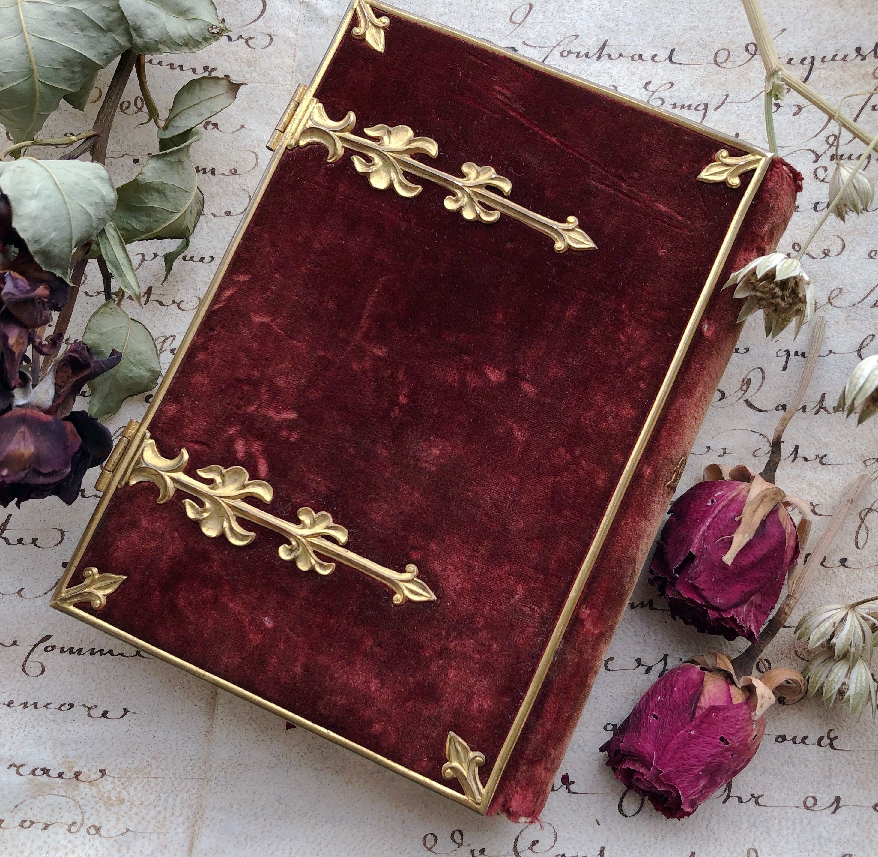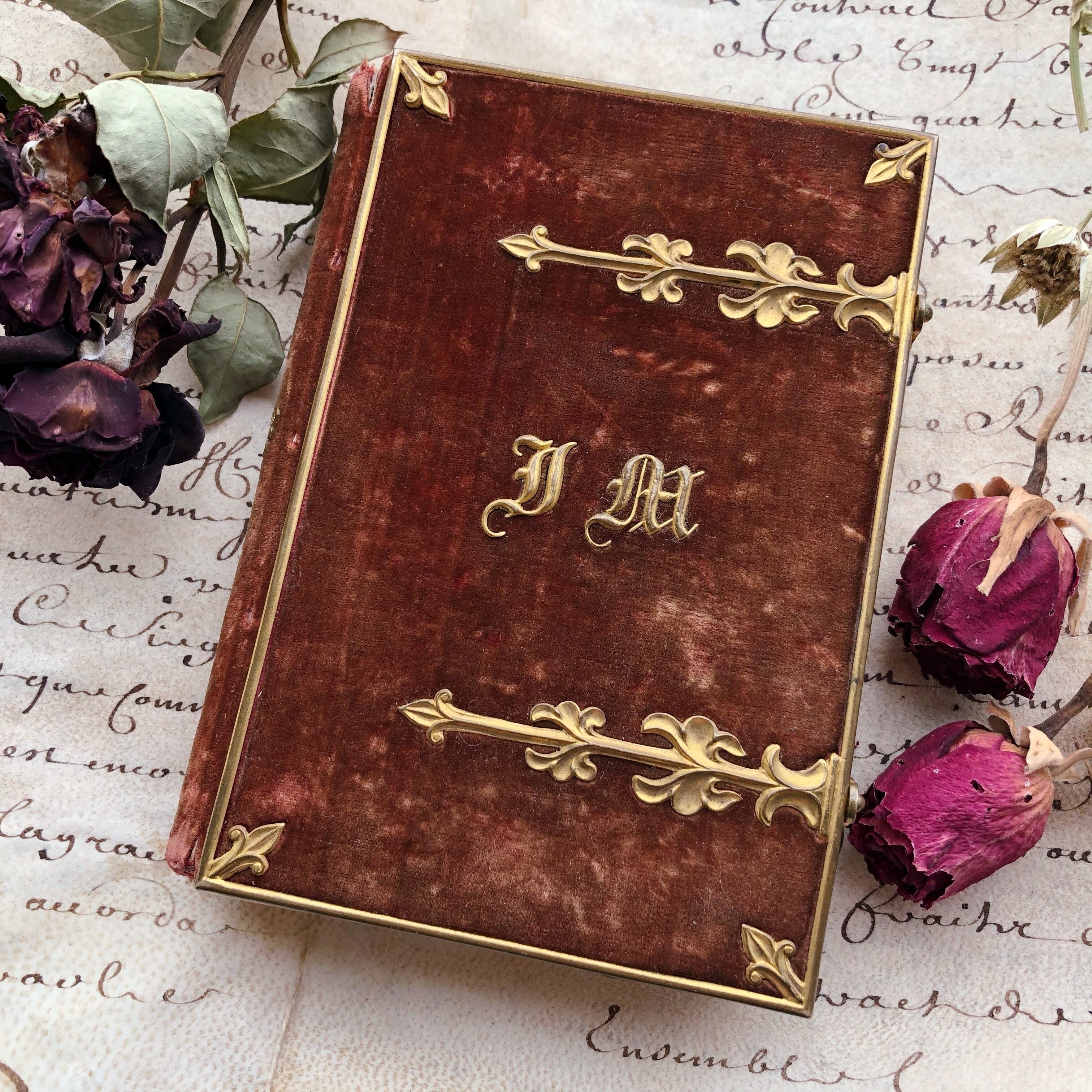 ベルベットの書籍、題して「結婚の書」はいかがでしょうか。こっくりしたマロン色のベルベットに金の装飾が施され、とても豪華で落ち着いた雰囲気です。小口の金色も鮮やかで美しく、背表紙のプレート、留め金も二つとも健在。ホーリーカードが一枚挟まっておりました。それもお付けします。表紙にフラクトゥールでイニシャルがあり、解読に自信はないのですが IM ではないかと思います。