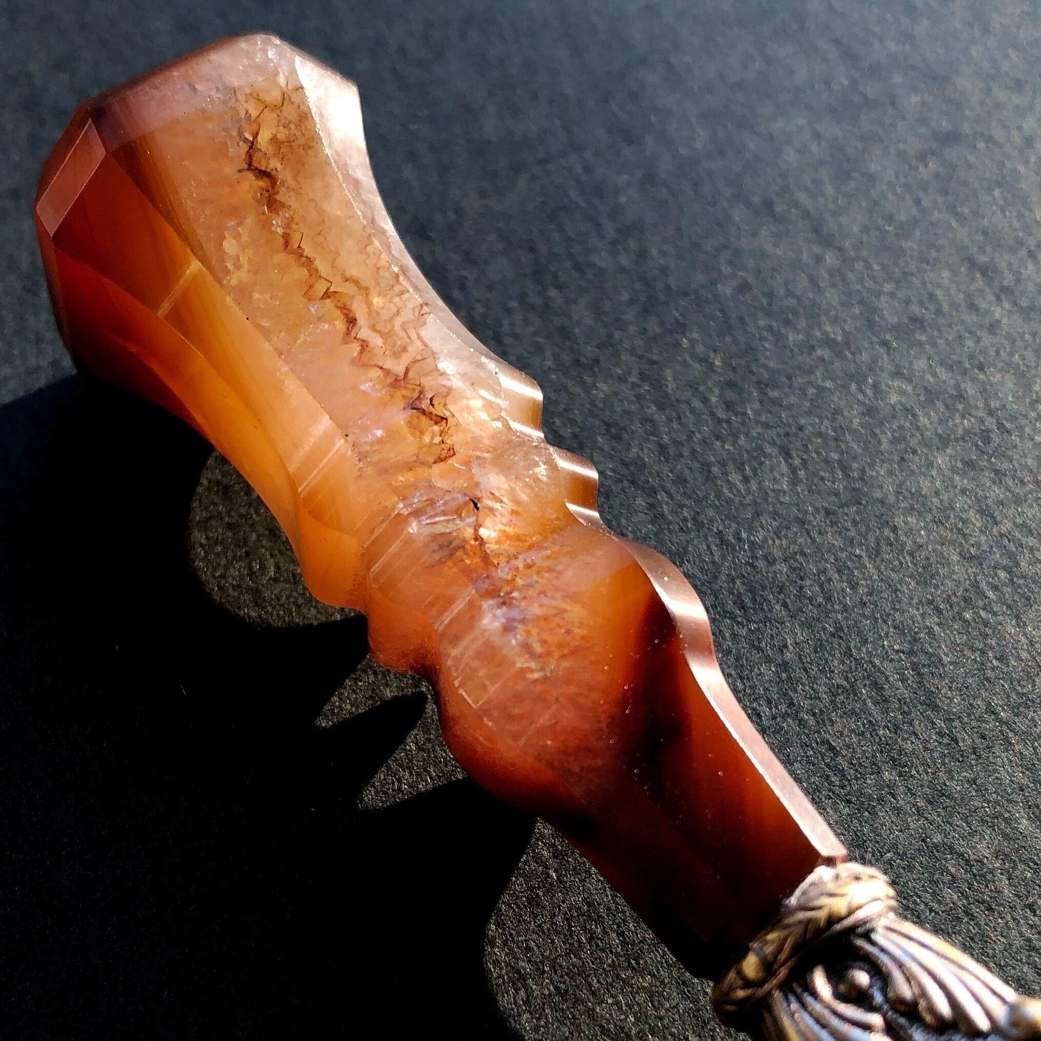 乳白色から赤茶まで、持ち手の瑪瑙が複雑な表情を見せる印章です。ある程度光を通しますので、光を当てて見ると燃えるような景色になります。