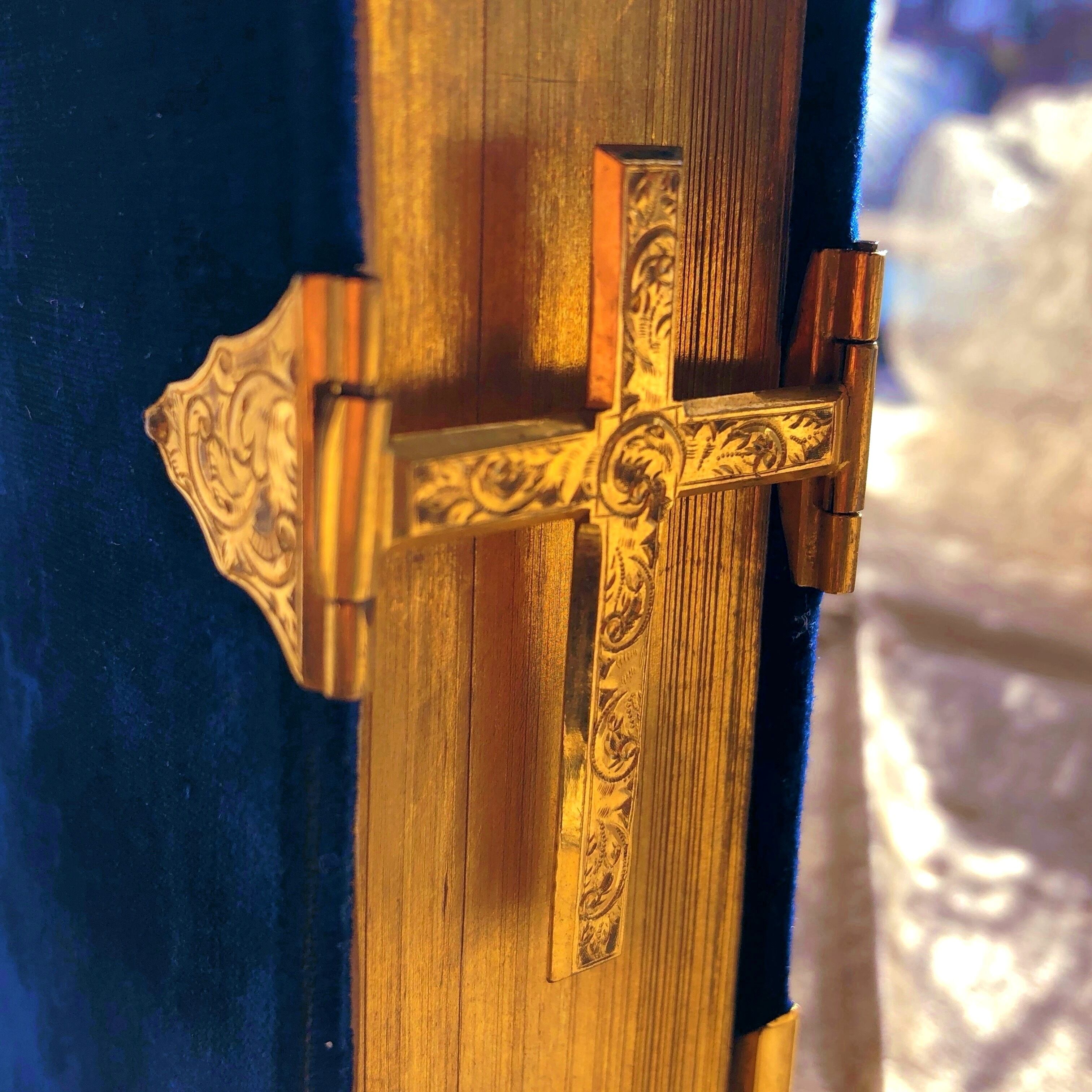 深いブルーの美しい祈祷書はいかがでしょうか。留め金は十字架形型で小口は金色。表紙は金色の金具で飾られています。古い祈祷書は装丁の金具が一部失われているものも多いのですが、こちらのお品は表紙、背表紙ともに全て揃っています。ベルベットの縁の部分に若干の擦れが、また見開きの綴じに若干の切れがありますが、全体に状態は大変よいものです。