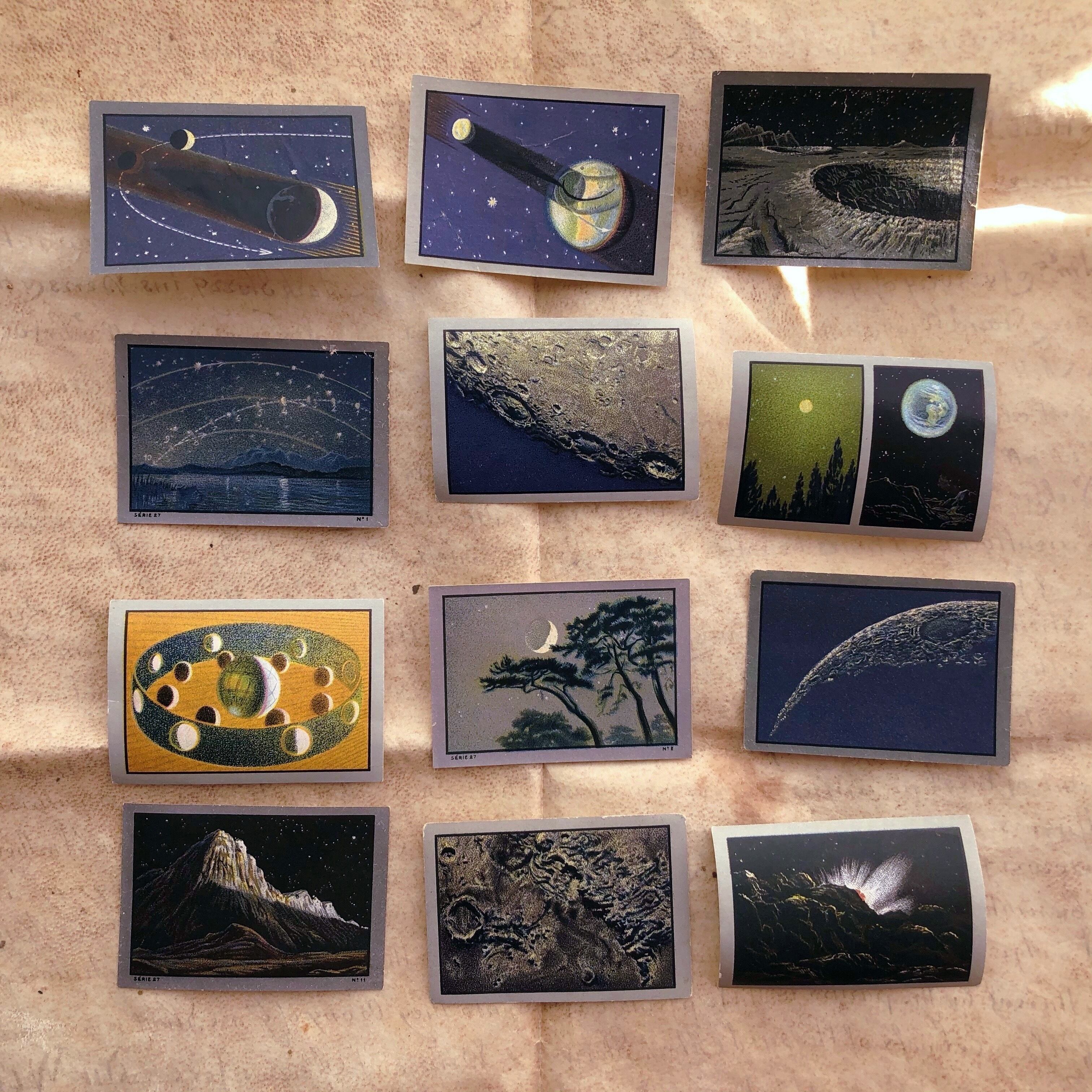 スイス製で、裏にはフランス語とオランダ語で天文についての説明があります。シリーズNo.27との記載があるものは1932年、No.38と記載のものは1950年のもので、2種類の製作年のカードが混在していますが、どちらの年も絵柄は全く同じなので、全体としては12枚コンプリートセットとなり、カードのサイズは約4×5.7センチです。