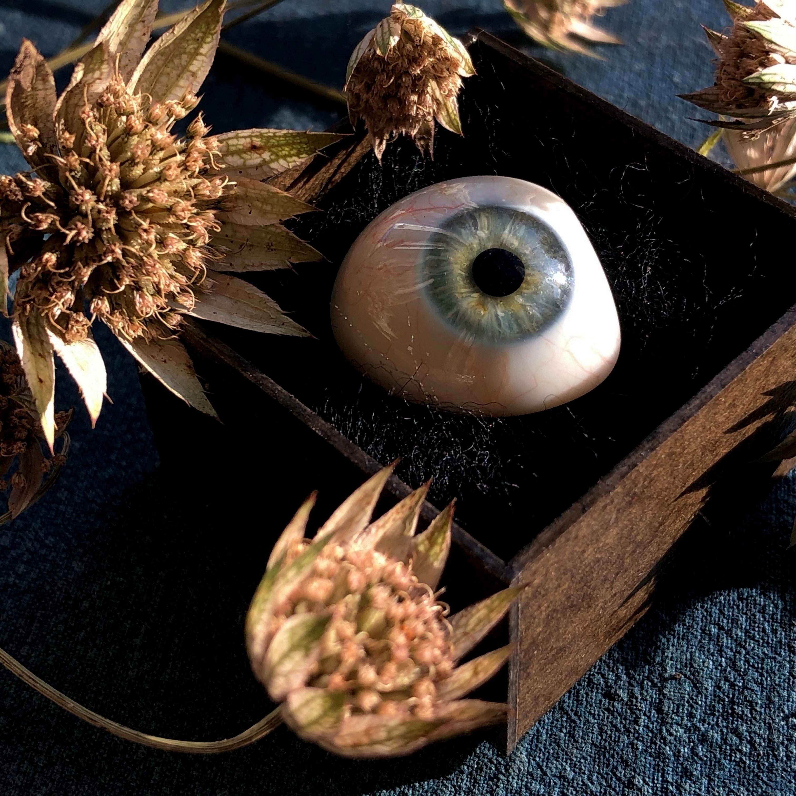 湖面に映る影、この義眼の影は光に満ちて、その色味はほんのりと柔らかいのです。全体が綺麗な青と見えるのですが、よく見るとごくわずかに滲み出すような緑を感じ、そこに薄い青、濃い青、クリームイエロー、茶、白の線が複雑に重なり合っています。きっと湖面から目をあげれば、そこには柔らかな光と風の中に春の初めの木々が揺れているのでしょう。虹彩の外縁は光を帯びて瑞々しいブルーグレーです。