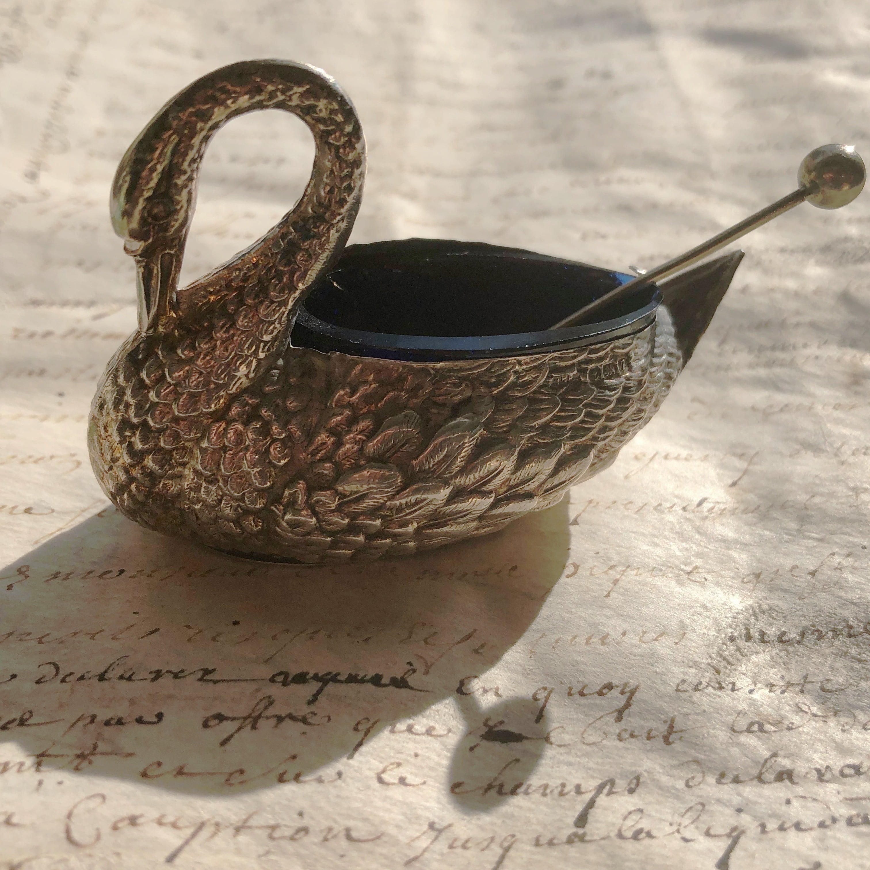 銀の白鳥のソルトポットです。素材はスターリングシルバーで、1924年、イギリス、バーミンガムのアッセイオフィスで検定された刻印が押されています。メッキではない銀の古色を帯びた質感は、やはりよい雰囲気で存在感があります。付属の小さなスプーンにも同じ刻印があります。