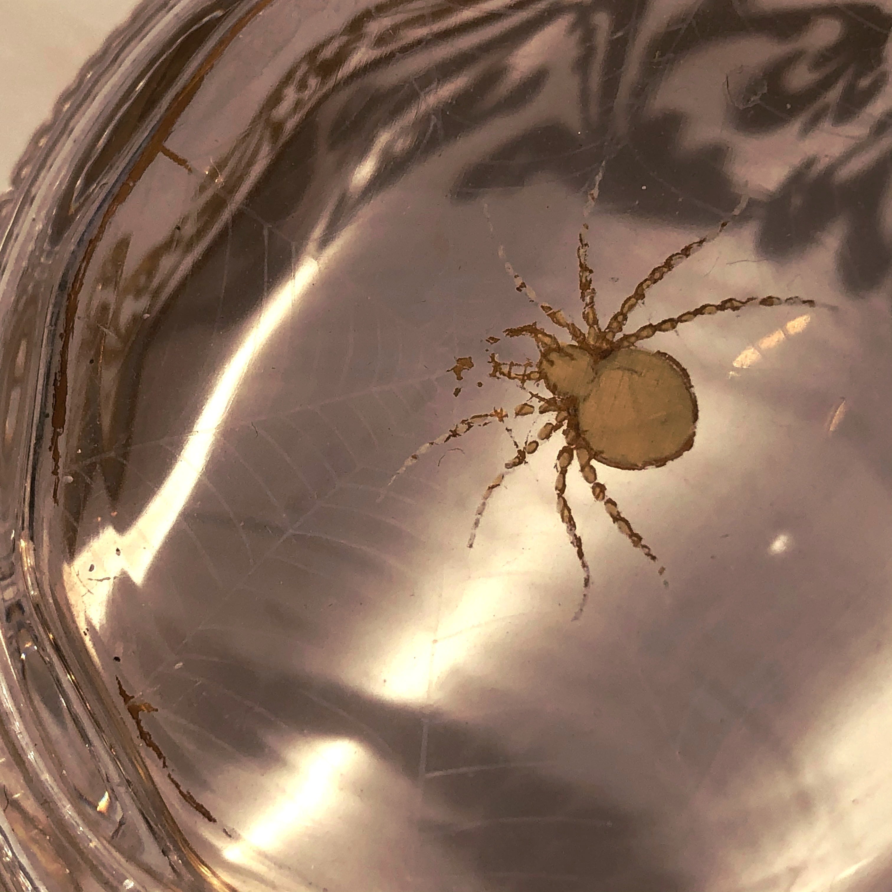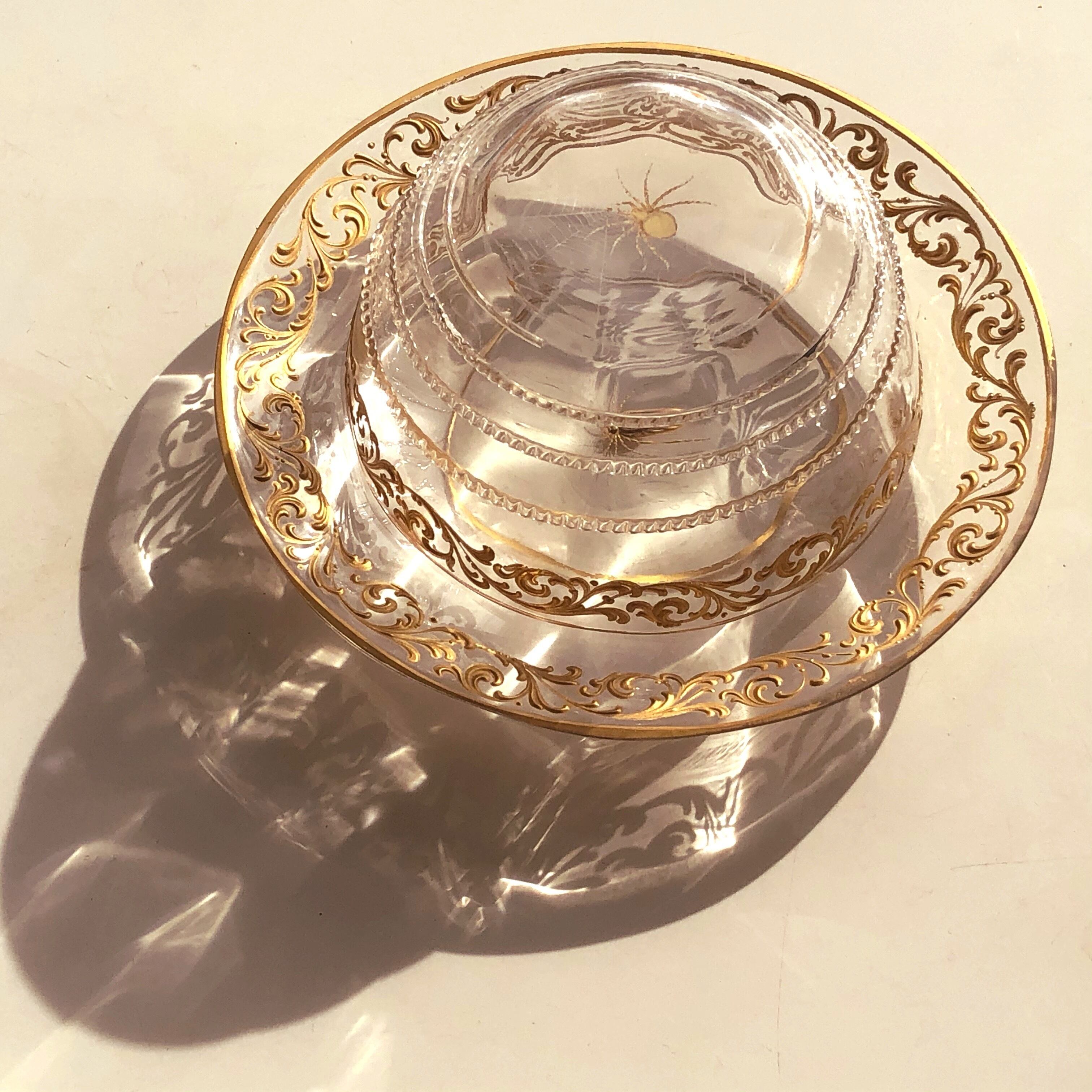 蜘蛛のフィンガーボウルはいかがでしょうか。19世紀チェコはモーゼルクリスタル、珠玉のガラス工芸です。金彩がたっぷりあしらわれたフィンガーボウルの底には二匹の蜘蛛が。こちら、ボウルとお皿に一匹づつ描かれています。極めて細い蜘蛛の糸もリアルに描かれていて、まるで本物のよう。
