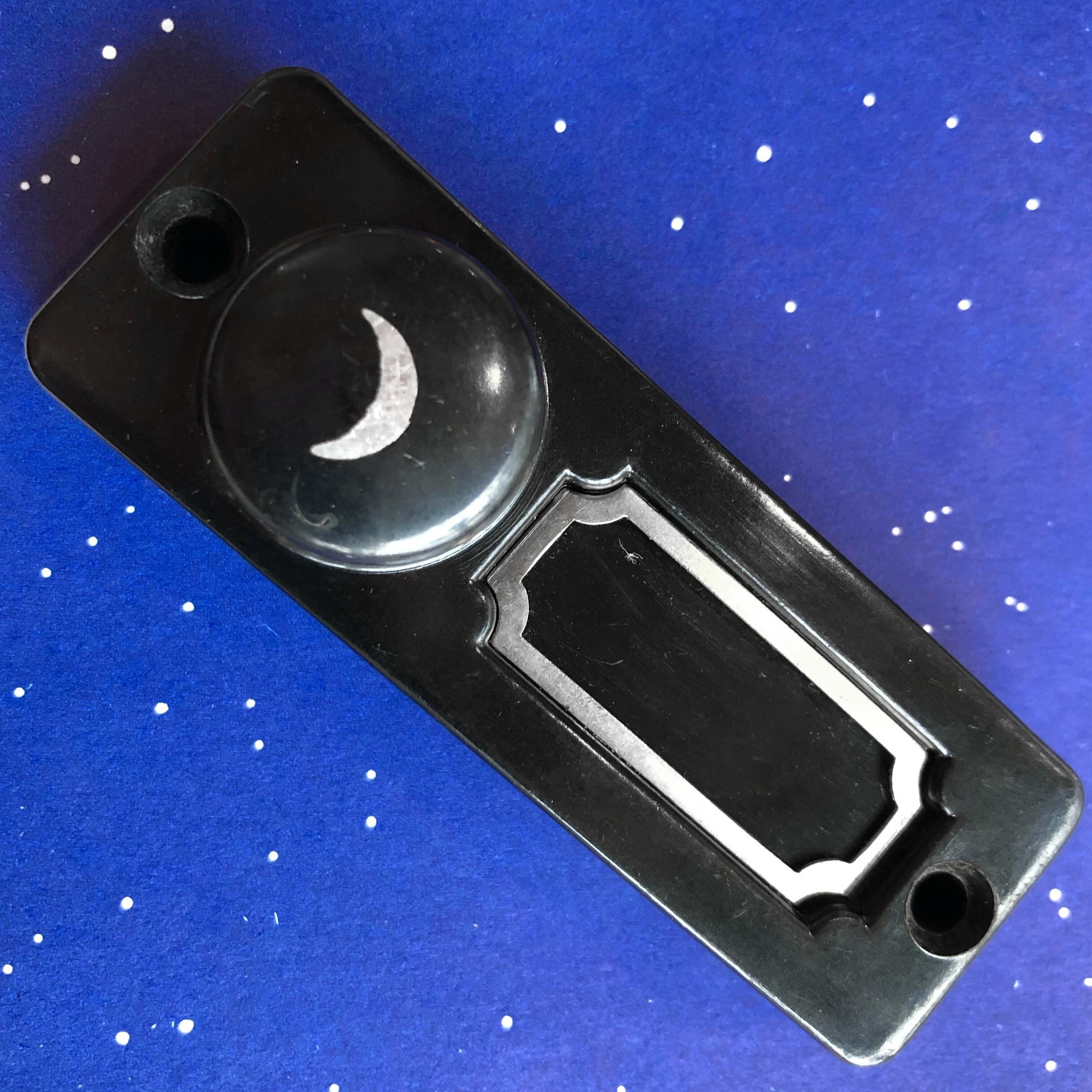 黒い樹脂製のスイッチです。押すところに三日月マークがひとつあるところが、何故と思う部分もありながら、なんともキュートです。押すと通電し、離すと切れる仕組みのようで、名札を入れるのにちょうどよい長方形の溝もあることから、呼び鈴のボタンと思われます。アパートメントにずらりと並んでいたのか、通りに面したドアに一つずつ付いていたのか、想像するとちょっと面白いですね。