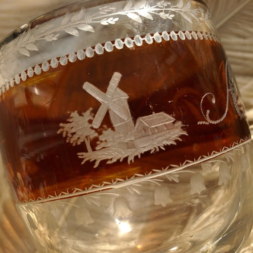 どっしりと大振りなガラスの杯です。十字架のそばで働く人、風車、木の下で考えに耽る人、柳の下のお墓、ぐるりとスズランが取り巻き、モノグラムはシダの葉を使い、文字は A J と思われます。これらの絵柄が手のこんだ細工で彫られているのですが、謎めいていてまるで判じ物のようです。ひょっとすると誰かの人生を語っているのでしょうか。