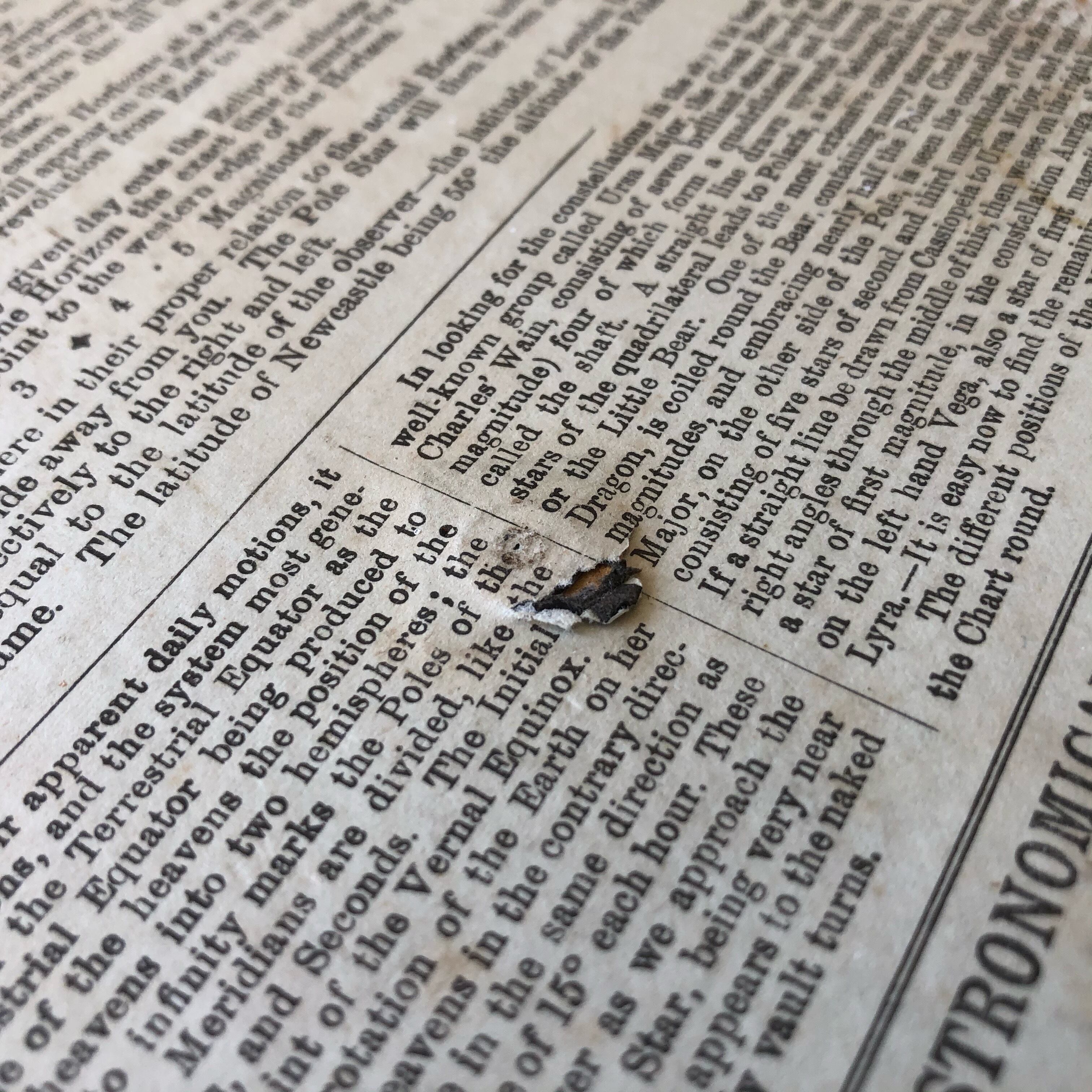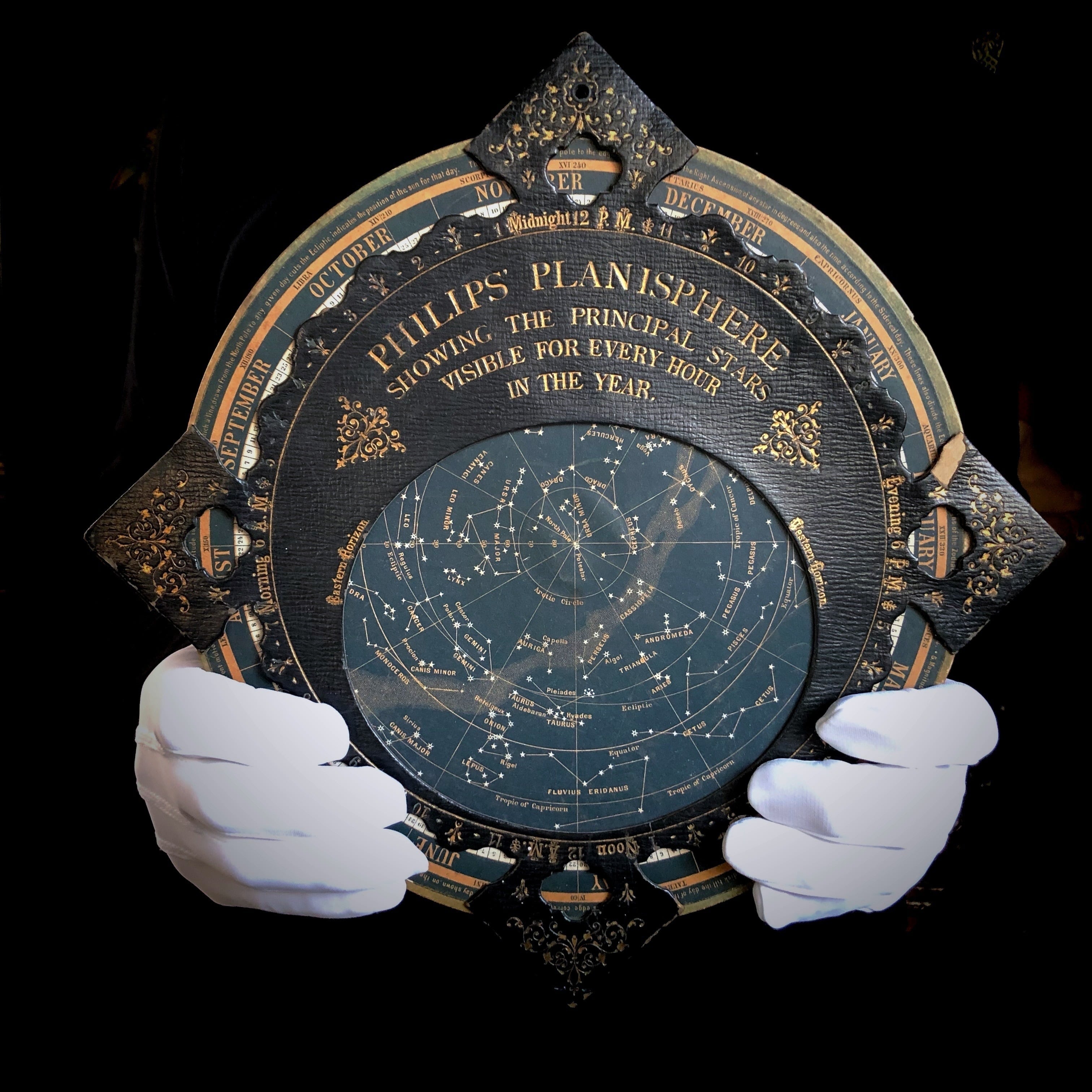 厚紙に金の型押し、ブルー系の星図円盤のデザインは、英国フィリップス社の早見盤でおなじみですが、それより10年以上先行し、その原型と言ってもよい、ドイツ、ドルトムントのクリッペル社製星座早見盤です。星座早見盤は、円盤を回して日付を合わせ、その日の夜空の星や星座を探す時に使いました。銀河鉄道の夜にも「円い黒い星座早見」というものが登場しますね。