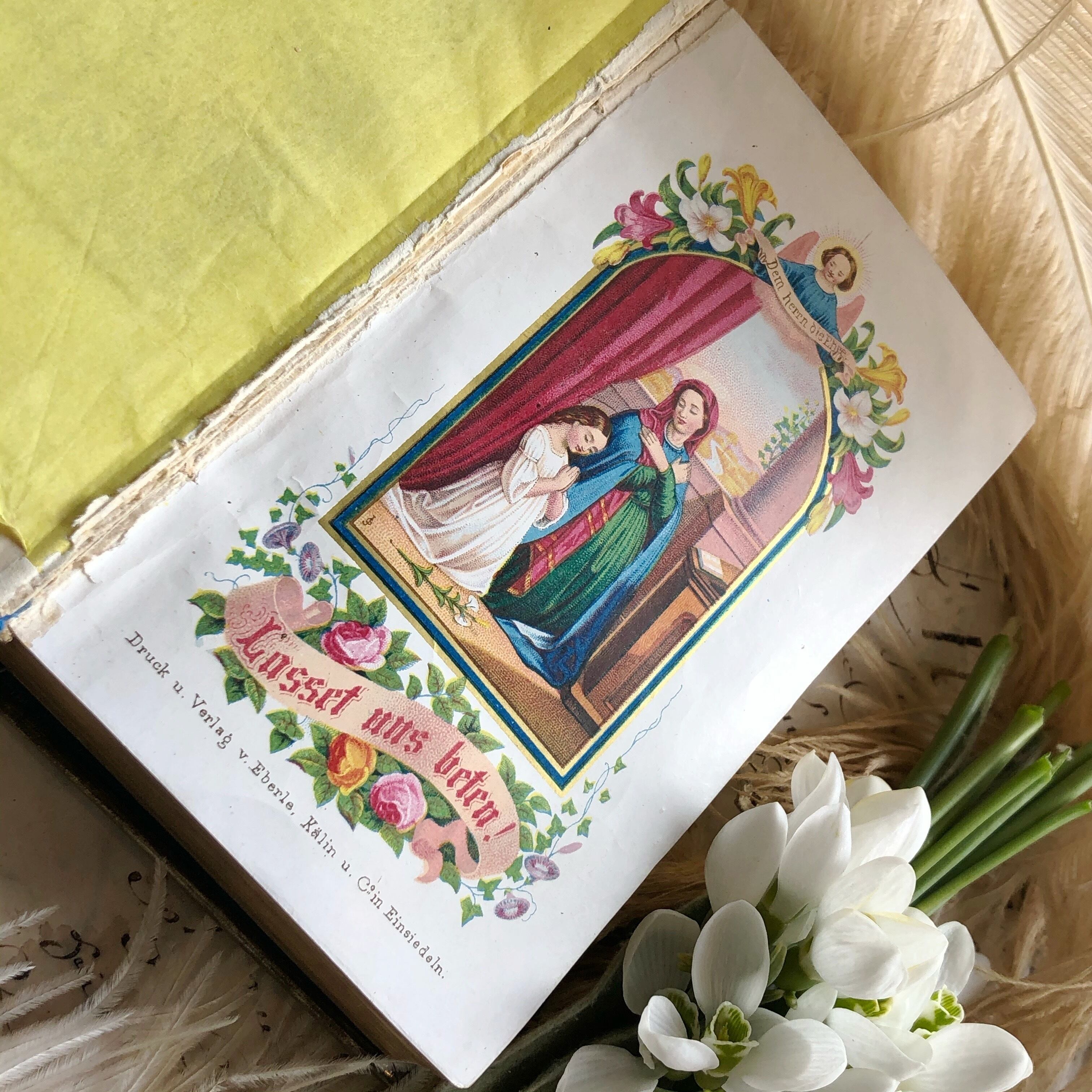 スイス製の祈祷書はいかがでしょうか。美しいベルベット張りで、小口の金や留め金も残っています。スイスはアインジーデルン製。ここはアインジーデルン修道院で有名な街です。ドイツ語で書かれ、華麗なカラーの口絵も付いています。おそらく1860年頃のものだと思われます。