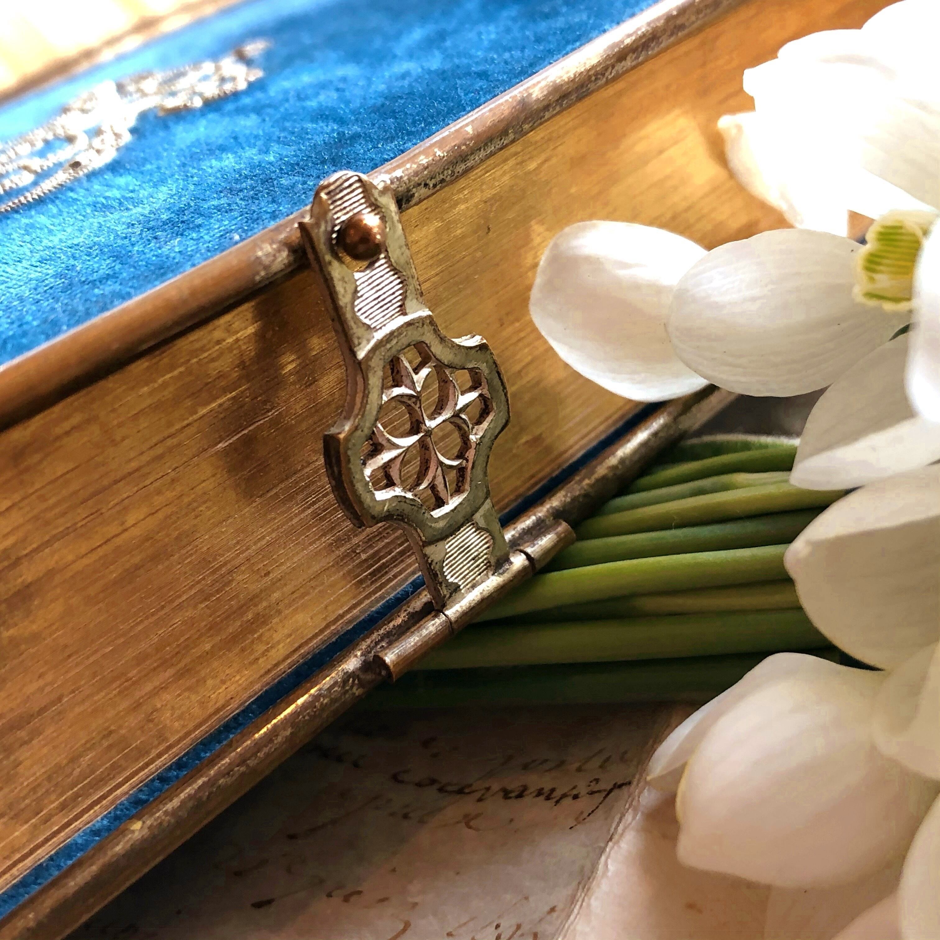 古いものですので、ベルベットに擦れや傷、色褪せがあり、表紙の周囲を囲んでいる装飾の金属に若干の浮きがあります。