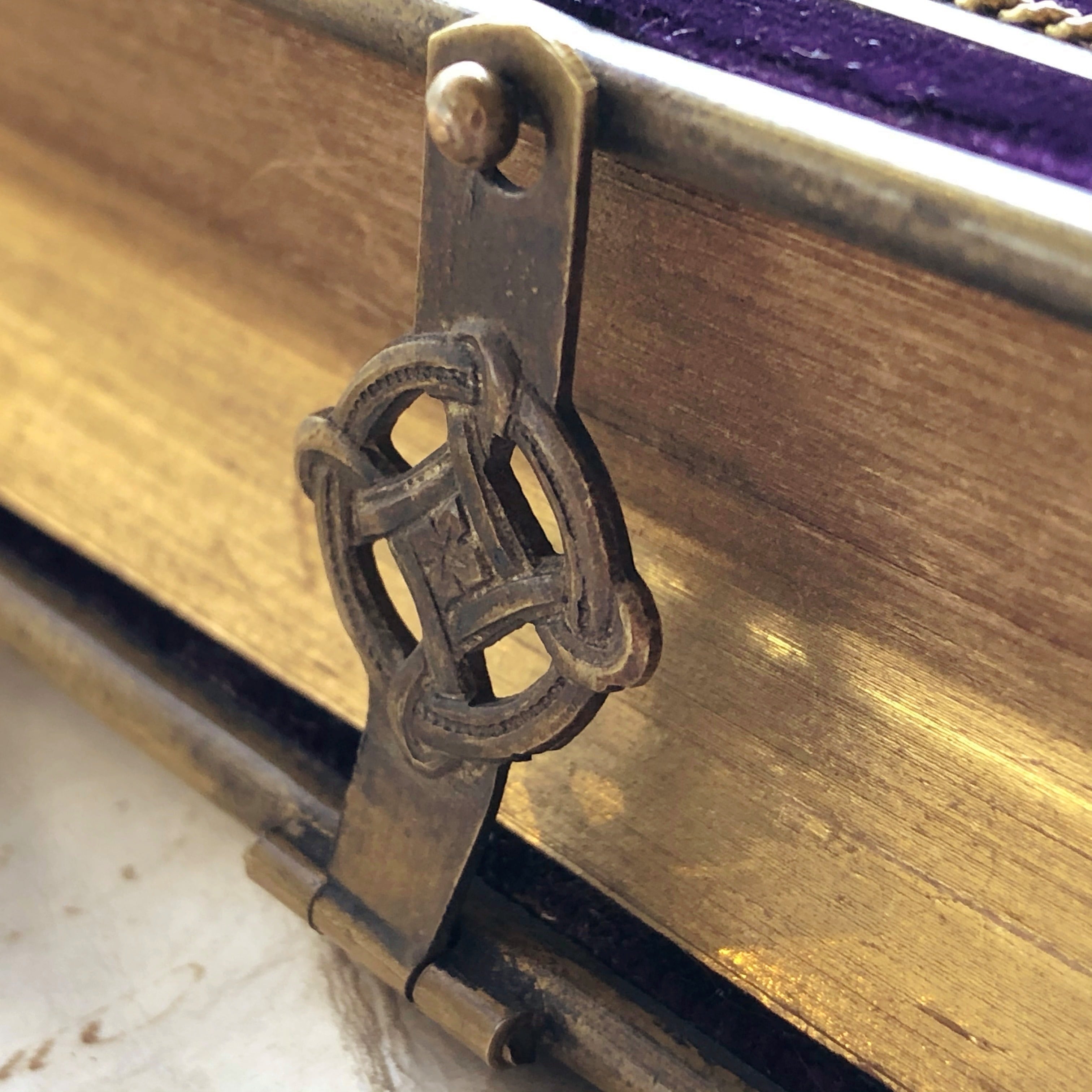 こちらは、紫のベルベットにとても繊細な金属の装飾が施されています。表紙、正面のモノグラムと十字架の組み合わせは大変手の込んだデザインで、かつての持ち主のイニシャルではないでしょうか。その周囲の意匠もひとつひとつが細部にまで気を配ったもので、時代を経た鈍い光沢も素敵です。