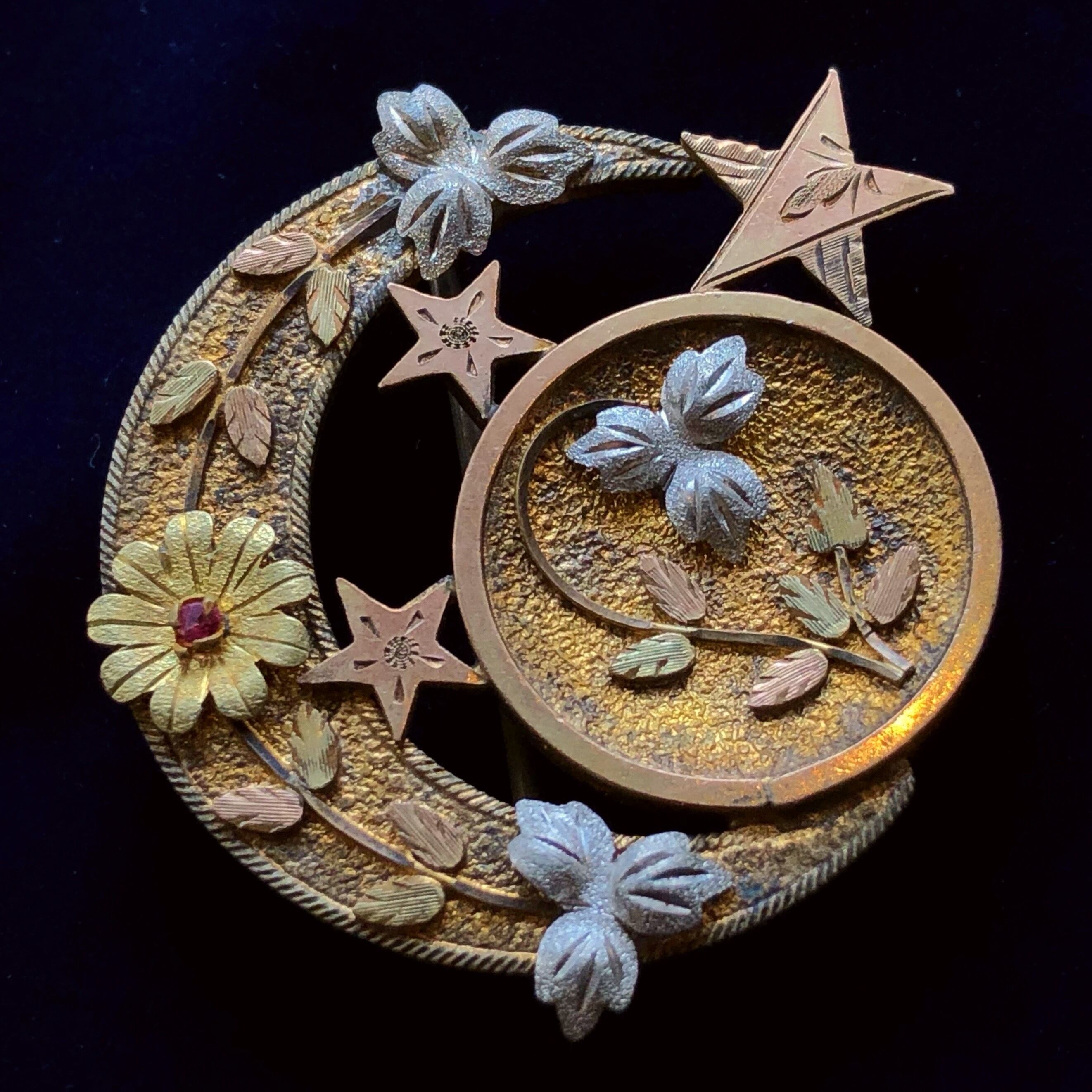 星と月のブローチはいかがでしょう。こちらはヴィクトリアンの三日月に星と花が散らされたブローチ。リズミカルでロマンティックですね。星と月のアクセサリーはそれだけでファンタスティックですが、この頃のデザインは新世紀への期待や憧れが乗っていて、ワクワクするような躍動感があるような気がします。どんなお洒落な人が身につけていたのでしょうね。そんな事を想像するのもアンティークの楽しみだと思います。