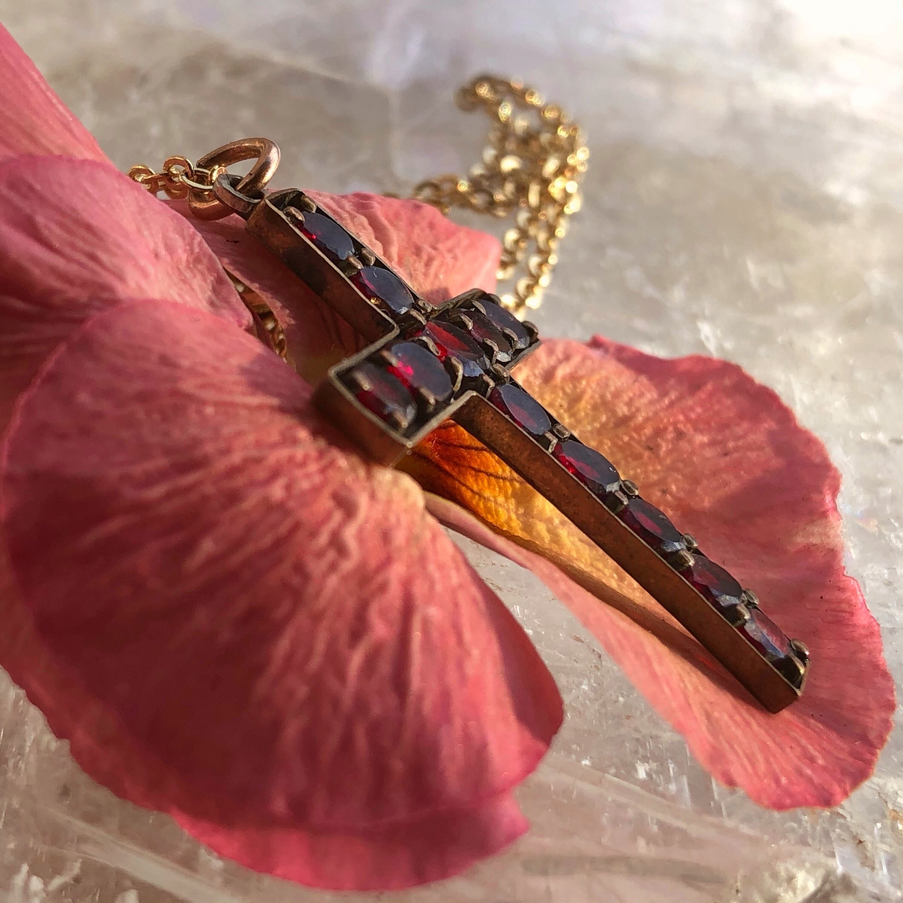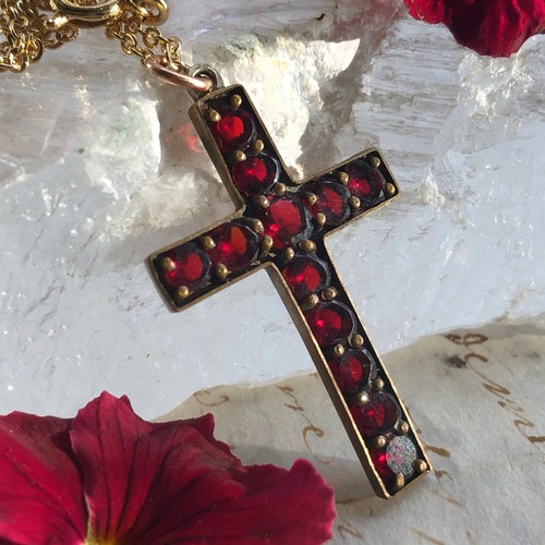 ボヘミアのガーネットを使った十字架です。ガーネットは瑞々しく深い赤で、全体は質素と言ってもよいようなシンプルな造りですが、台座の裏から光が入るとさらに複雑な色合いを見せ、それは教会のステンドグラスを通して目にする光の煌めきをふと連想させます。