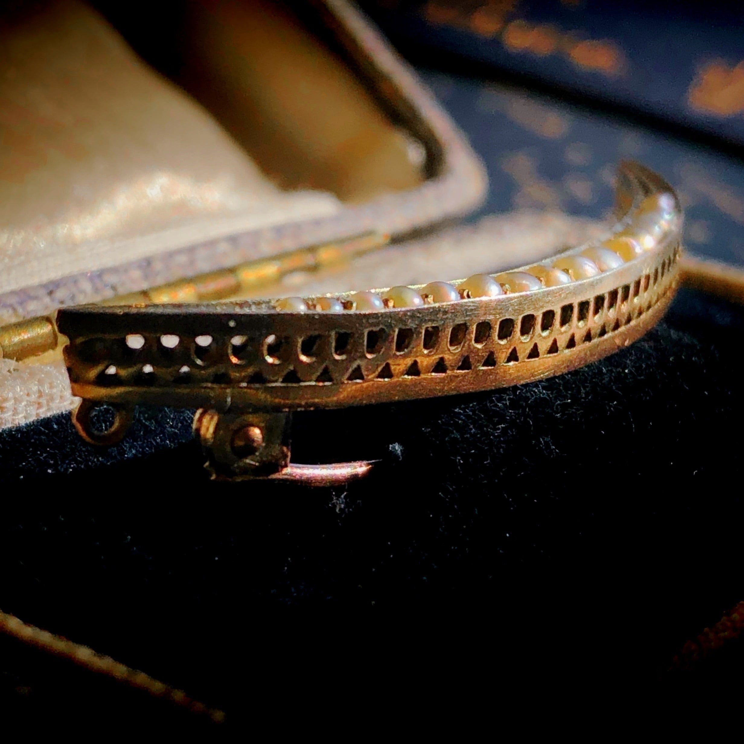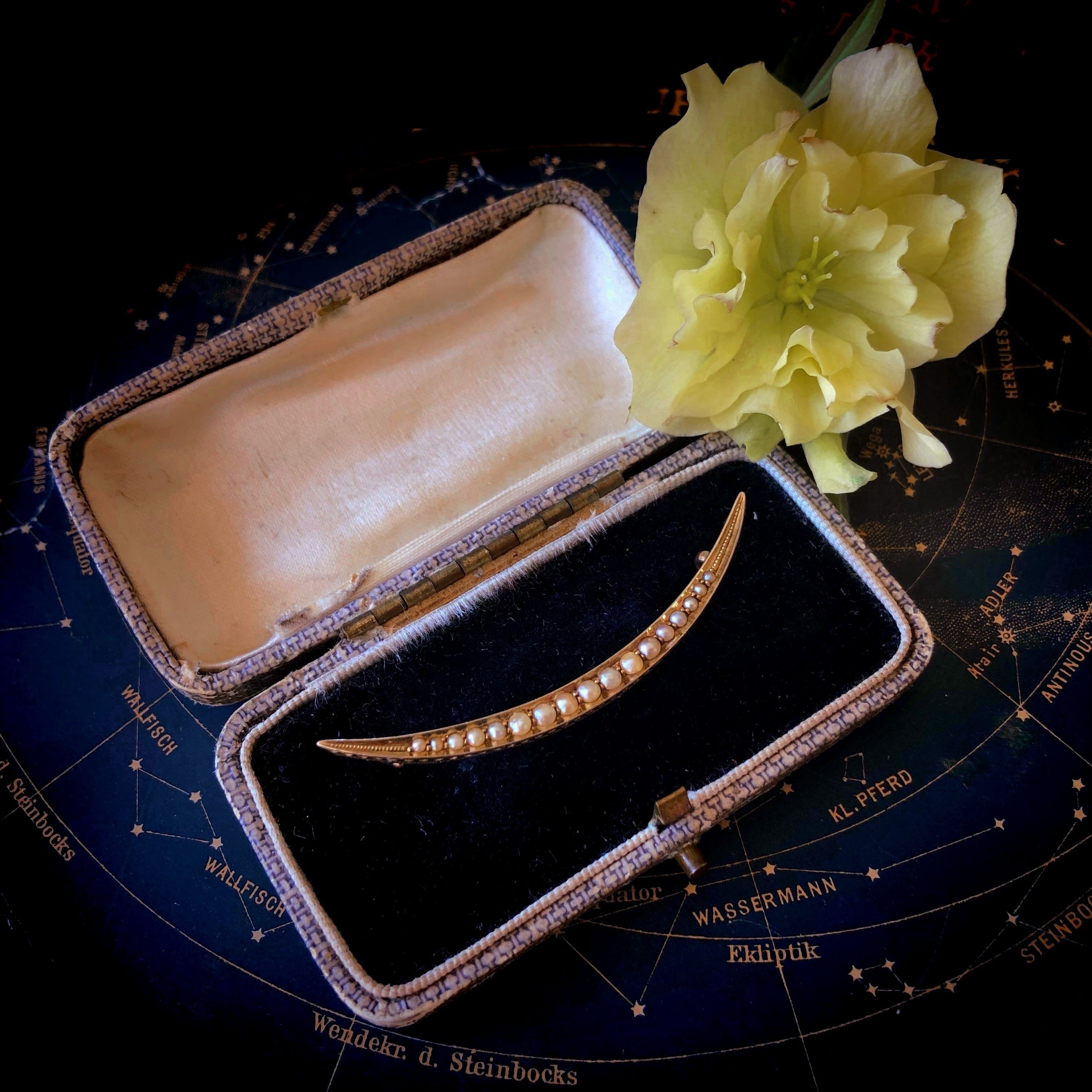1890年代から1900年頃、ヴィクトリア朝末期の三日月型ブローチです。大きさを少しづつ変えた小粒真珠を見事に配置しているのですが、これが一粒づつ真珠独特の虹色の光沢を宿し、すっきりと清楚な淑女にふとした妖艶さを垣間見ると言えばよいのでしょうか。