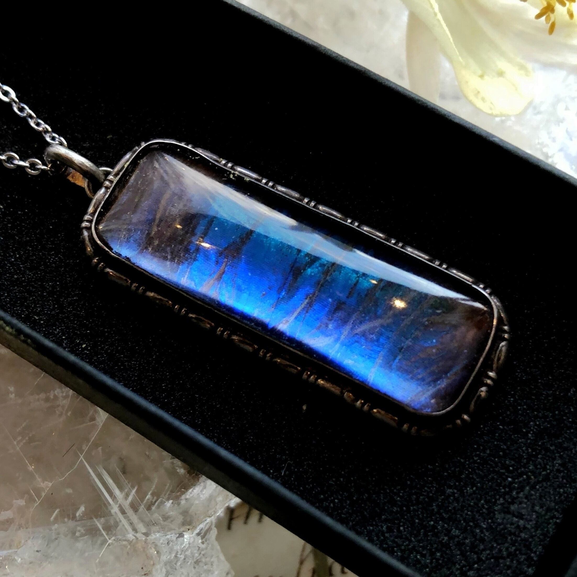 大ぶりなケースに見事なモルフォ蝶の羽が入っています。羽は天然のものですので、モルフォ蝶の装飾品は1点ずつ表情が違うのですが、こちらは輝く青から紫がかった濃紺まで、角度と光の具合でお楽しみいただけます。また、羽の模様が独特の立体感を生み、その筋によって全体が光沢を放つ水色と青に分割される瞬間もあります。