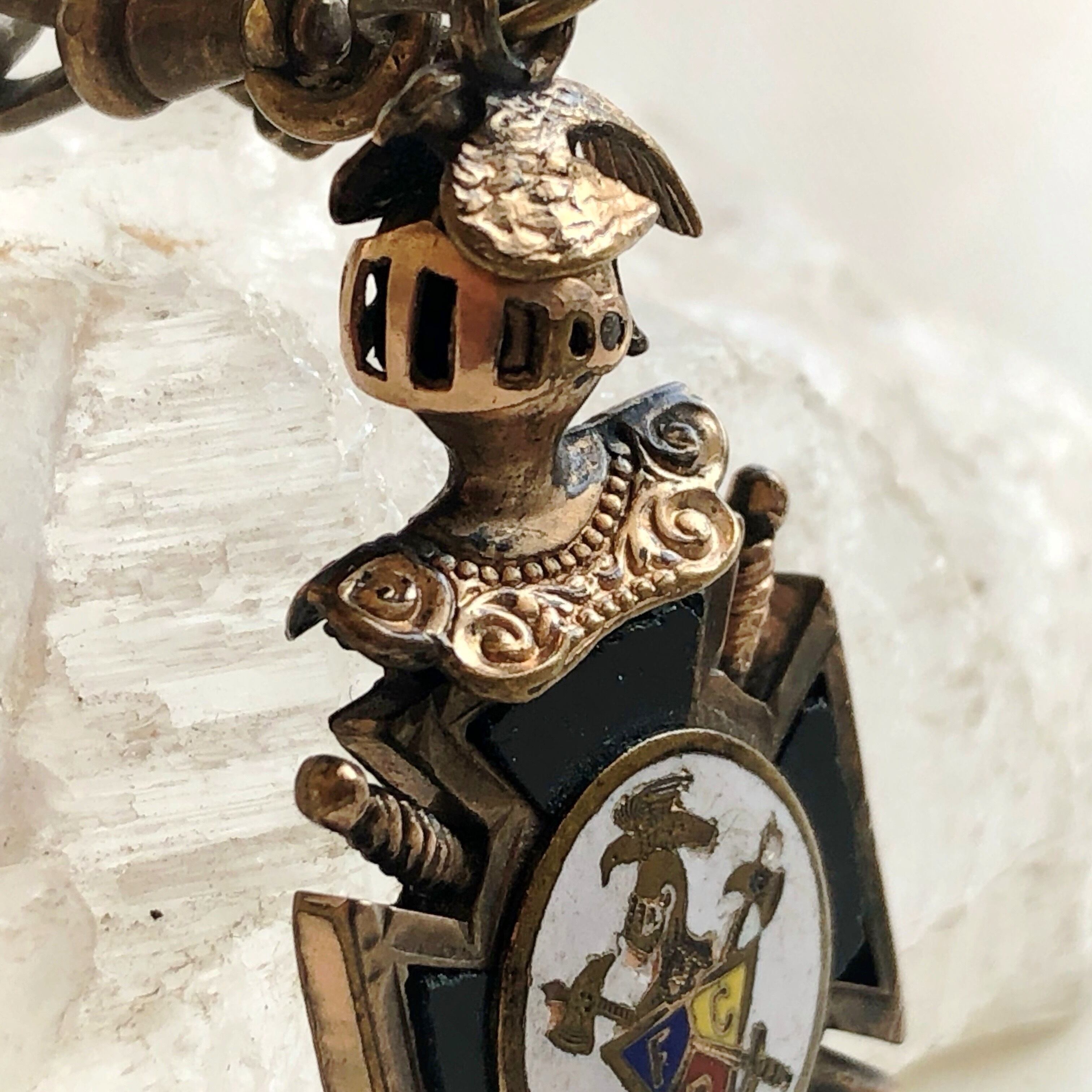 こちらは1864年にワシントンD.C.で結成された秘密結社ピティアス騎士団のフォブです。紋章に記された"F C B"の文字は、それぞれこの団体のモットーである"Friendship"「友情」"Charity"「慈悲」"Benevolence"「善行」の頭文字です。小さな甲冑の瞼甲は上下に動くという凝った作りです。