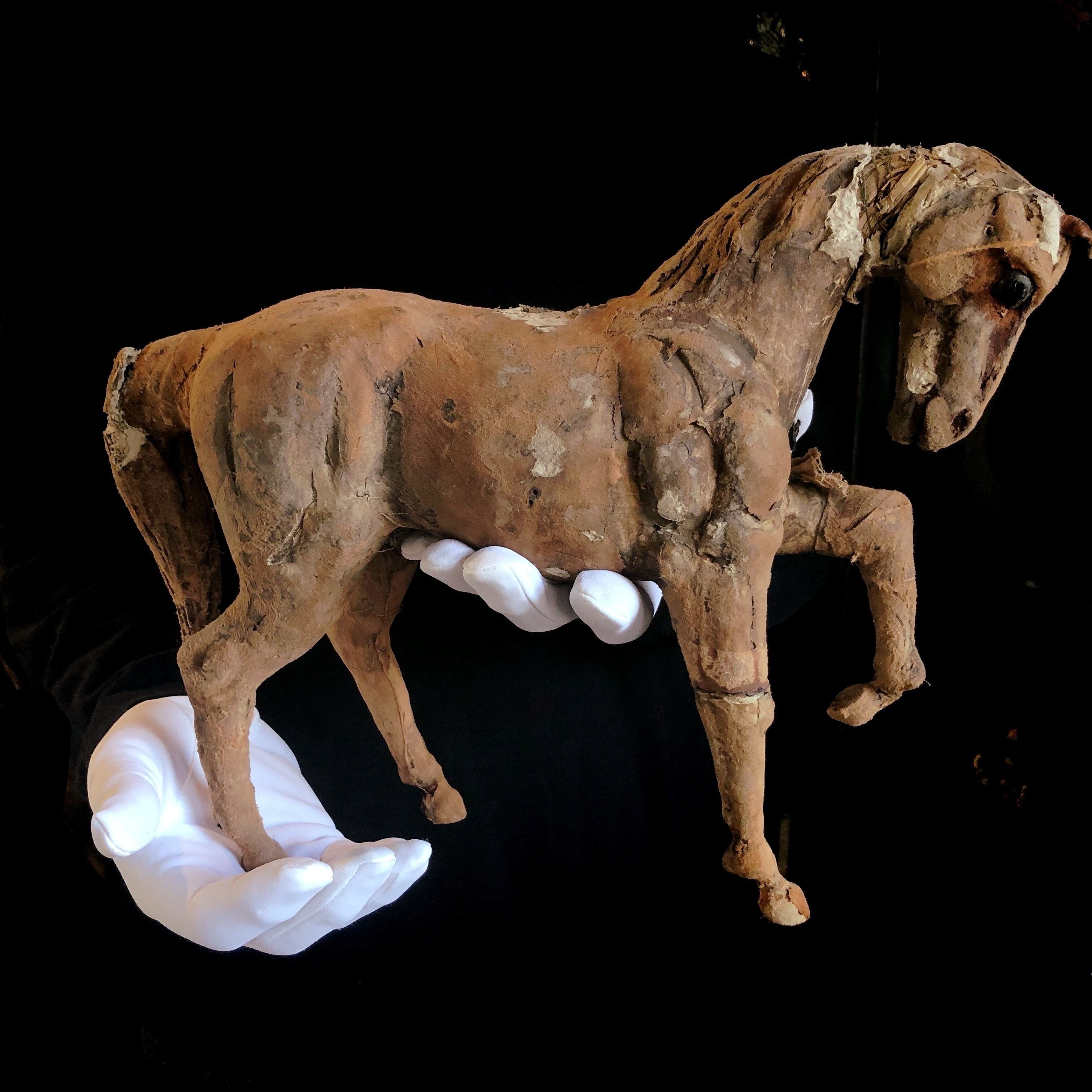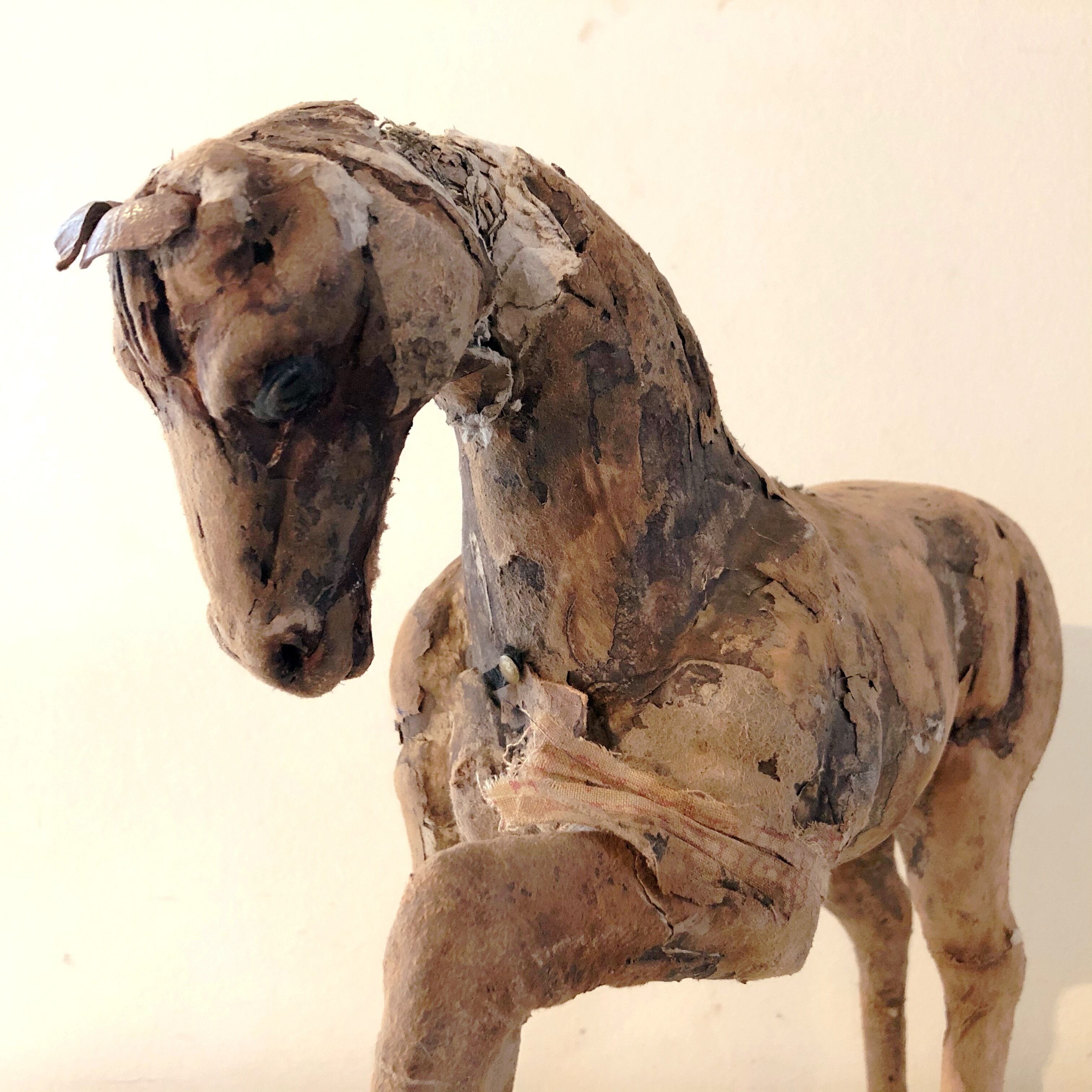 時の流れが作る造形、質感、雰囲気というものは様々ありますが、これもそのよい一例なのではないでしょうか。この馬は何かの芯に藁を巻き、布を貼り、その上に柔らかくしたボール紙を貼り付けたもののようです。彩色し、目にはガラス球が入っています。