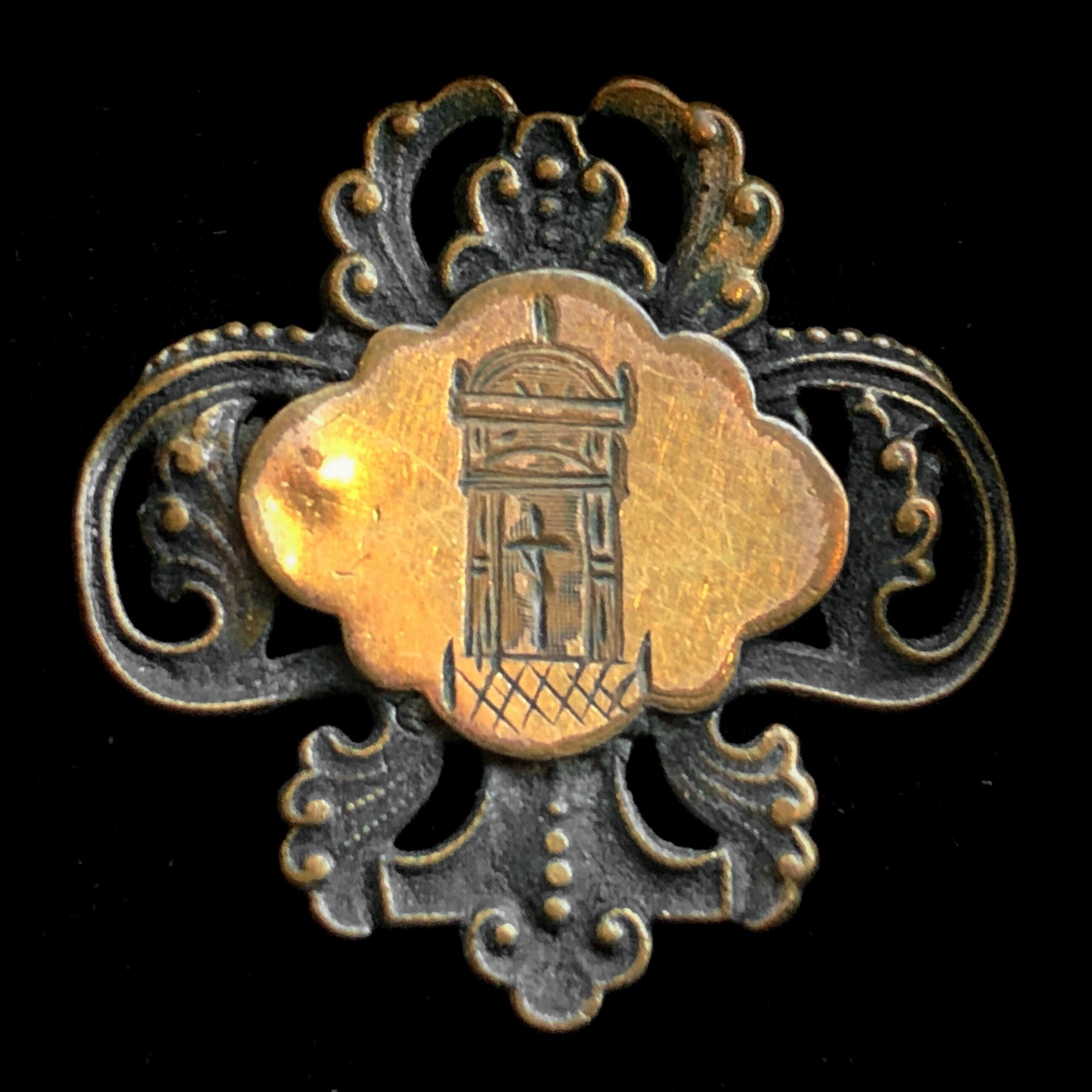 中央のプレートに霊廟、墓所と思われるものが彫られています。周囲はうねる植物をモチーフにした意匠です。プレートは古びた質感ながら輝きを放ち、周りの元は金色だったと思われる金属の表面は黒々とした古色を帯びています。生い茂った昼なお暗い森の奥で往時の面影を残しながら朽ち果てんとする霊廟を見るようです。