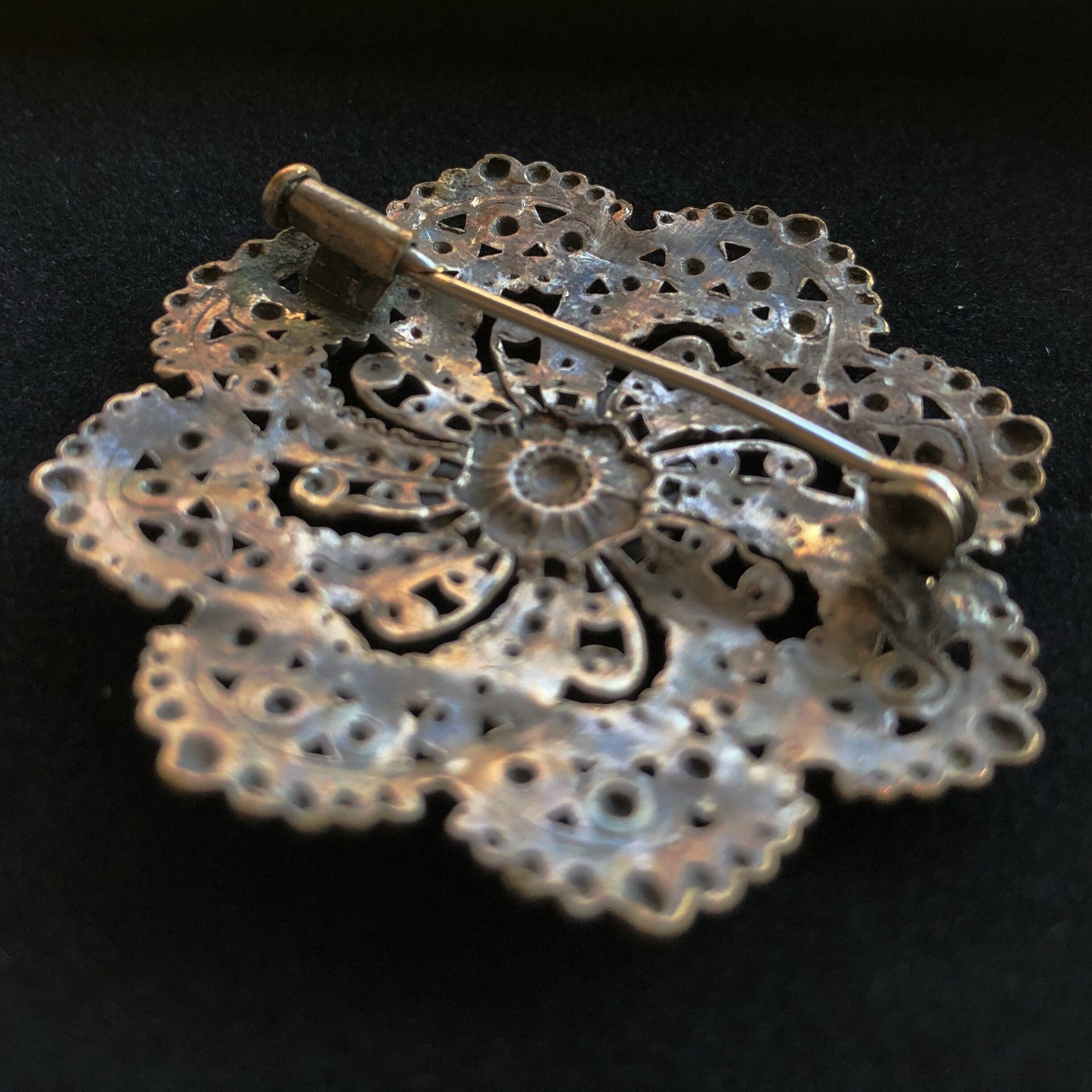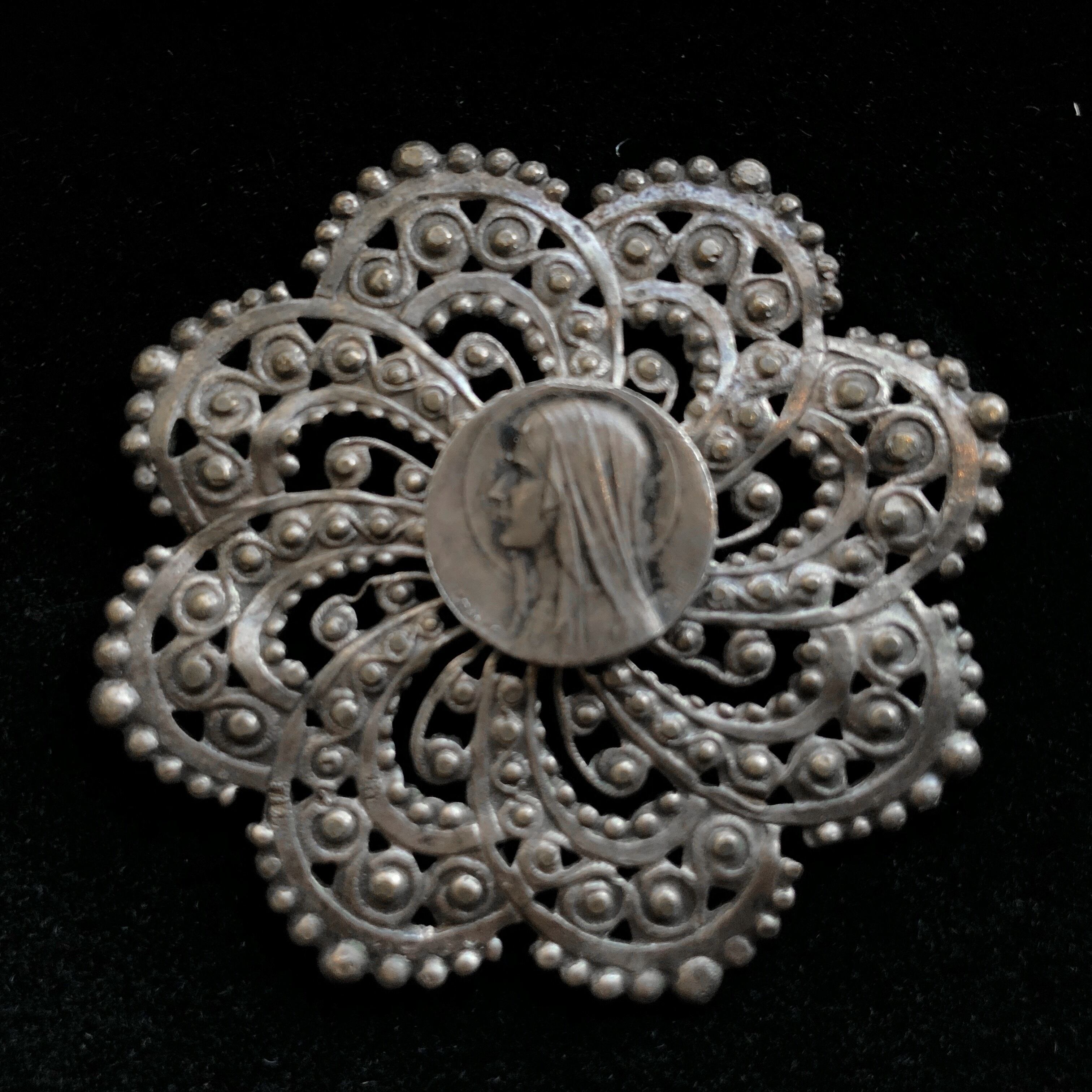 細かい細工の渦巻くような意匠の中心の女性の横顔はマリア様でしょう。こちらのブローチは、素材は鉄なのですが、表面が古色を帯びて質素な中に力強く鈍い光を宿し、鈍色と言えばよいのか、独特の色味と存在感を漂わせています。これも時の流れが創り出した素晴らしい質感の一例なのでしょう。