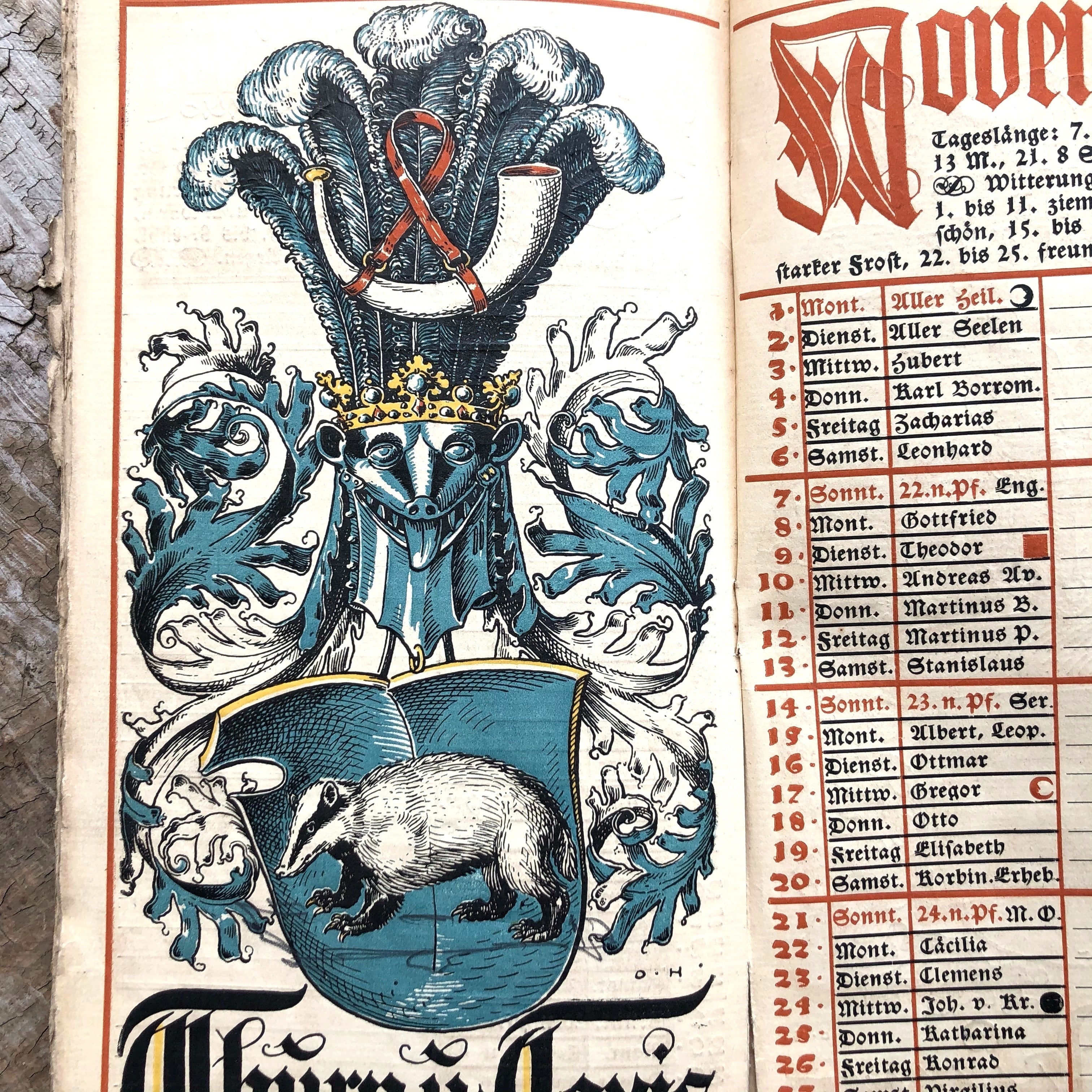 ミュンヘンカレンダーはいかがでしょう。こちらはオットーハップという紋章デザイナーが、1880年代にミュンヘンで発行を始めた暦です。当地で大変な人気となり、初年から10,000部以上発行されたそうです。毎年、工夫を凝らしたようで、表紙、各ページとも素晴らしく凝ったデザインでフォントもかっこいいですね。こちらは1897年のものですが、ミュンヘンカレンダーの中でも19世紀のものは一段と凝って迫力があり、実用品だけに古いものはより希少でもあります。