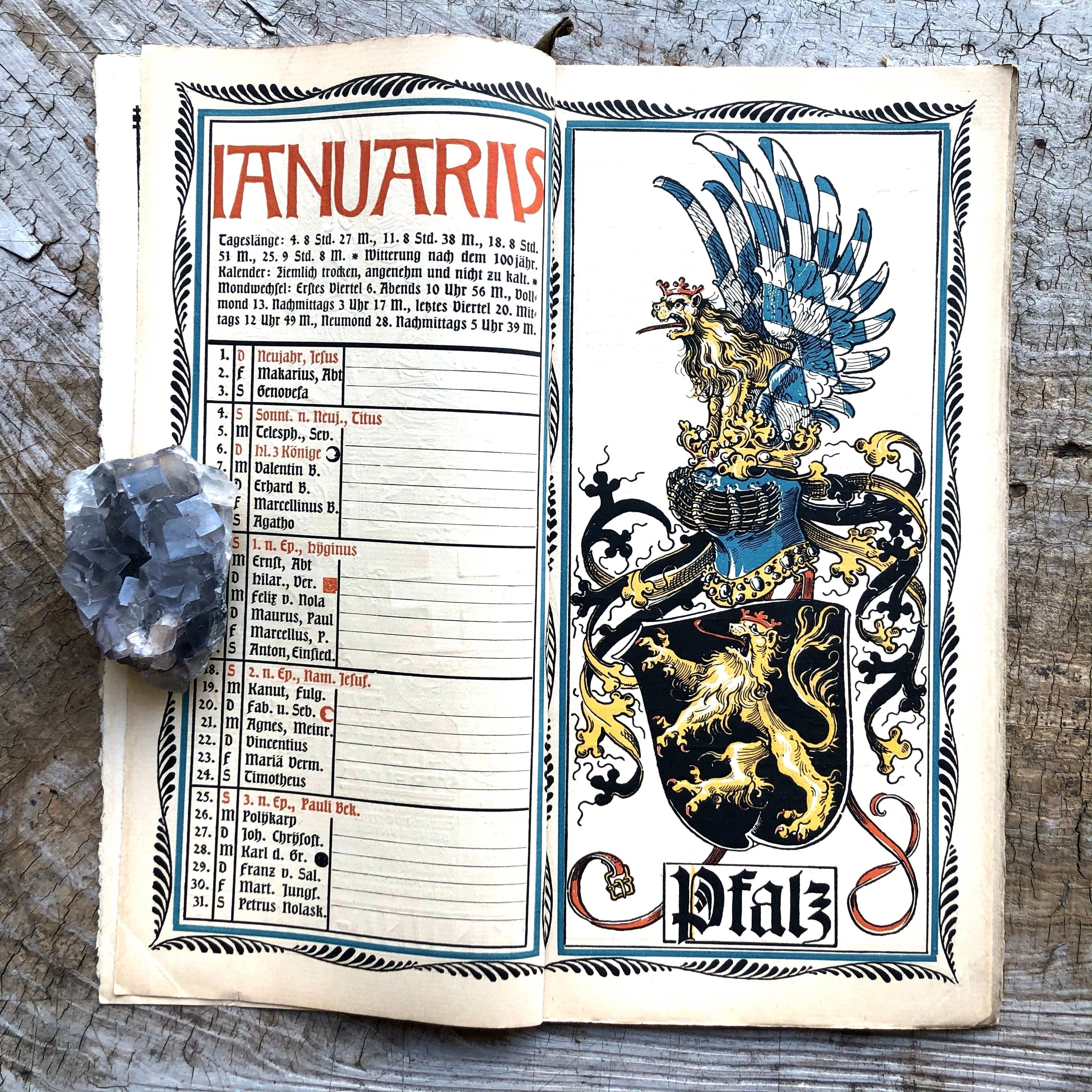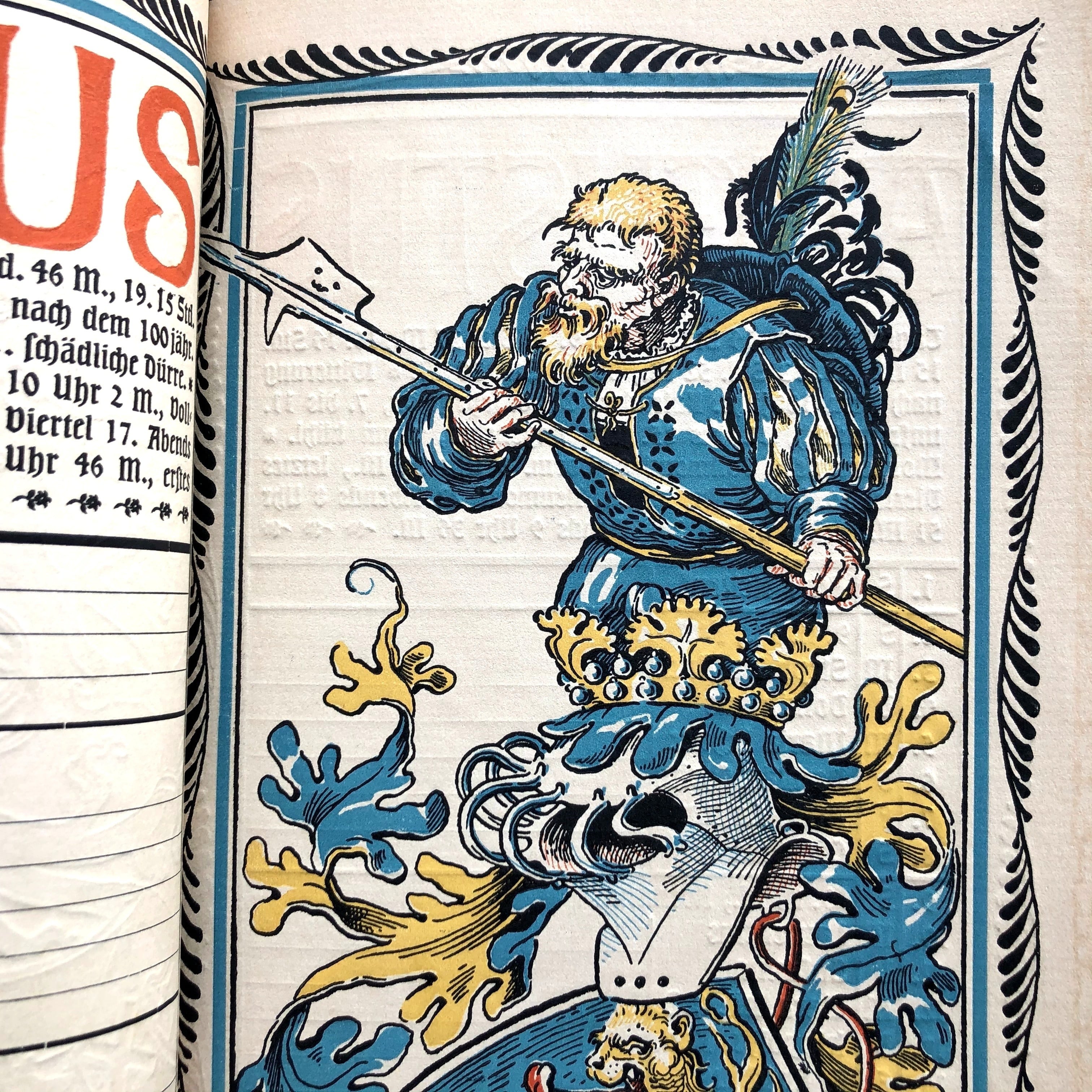 ミュンヘンカレンダーはいかがでしょう。こちらはオットーハップという紋章デザイナーが、1880年代にミュンヘンで発行を始めた暦です。当地で大変な人気となり、初年から10,000部以上発行されたそうです。毎年、工夫を凝らしたようで、こちらは1903年のものです。表紙、各ページとも素晴らしく凝ったデザインで、フォントもかっこいいですね。