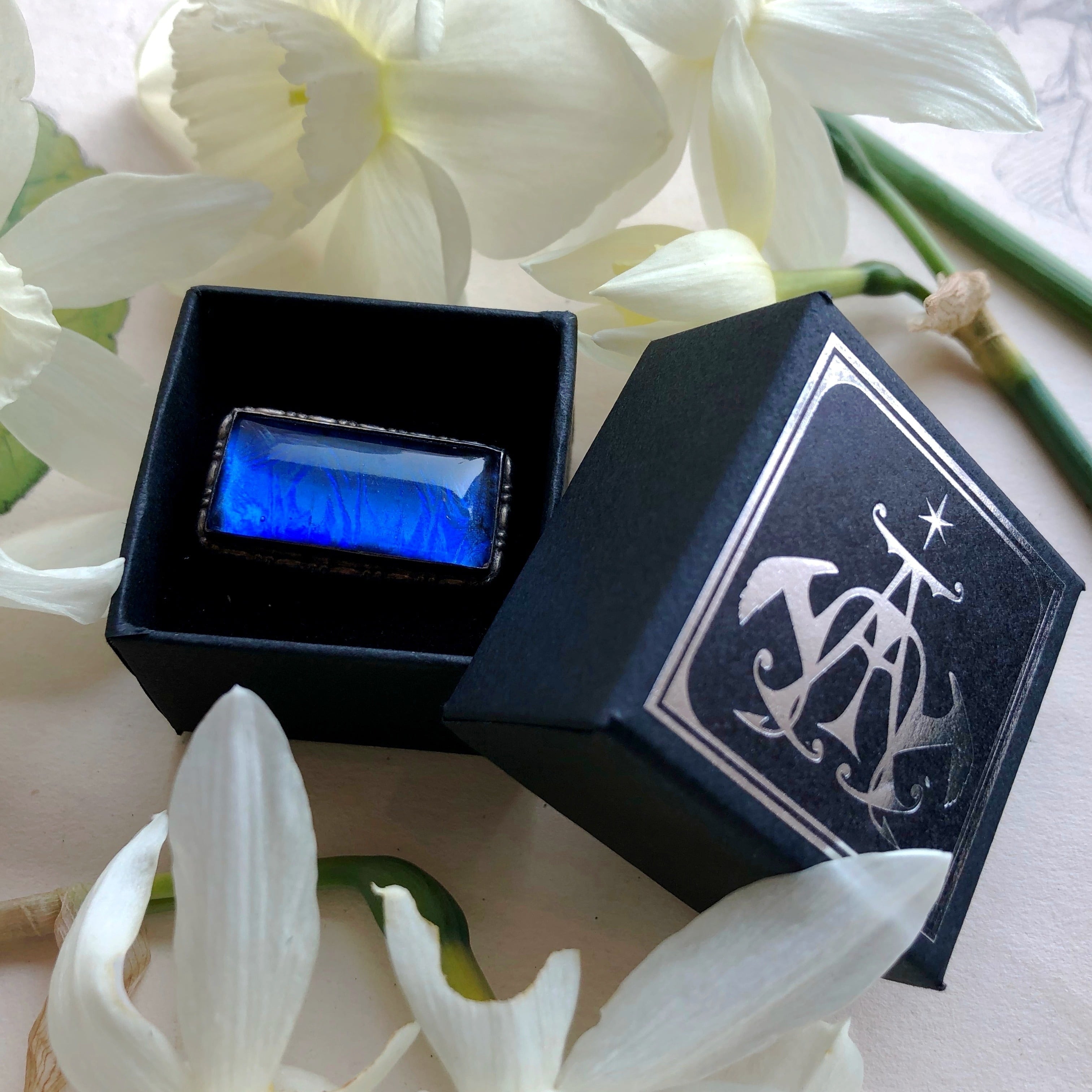 丸みを帯びた長方形のモルフォ蝶のブローチです。収められた天然の羽は、光の角度や具合で輝く青から濃紺まで楽しめます。また、羽の複雑な模様が不思議な立体感を生み、青と濃紺を立体的に織り上げたシルクの生地のような瞬間もあります。