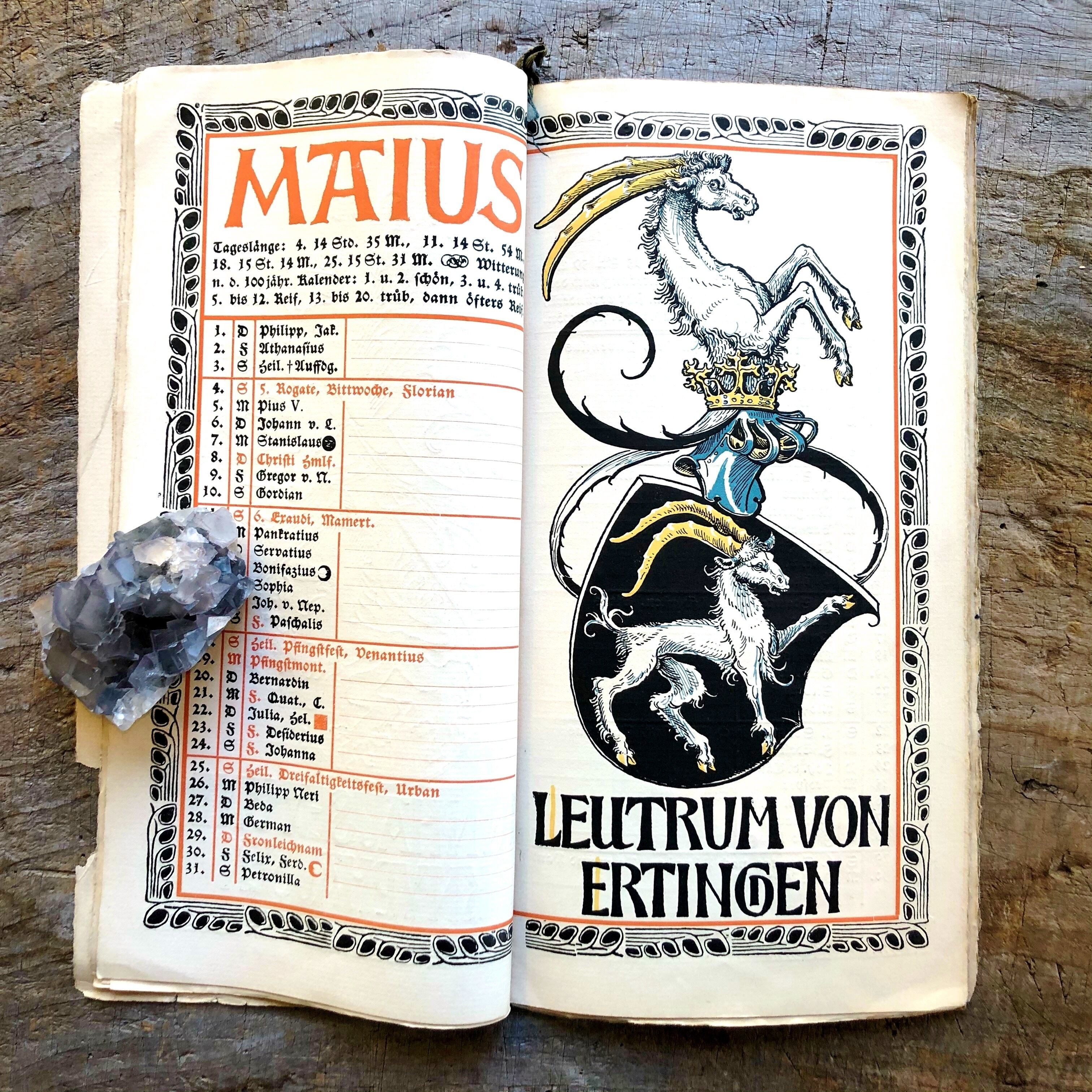 ミュンヘンカレンダーはいかがでしょう。こちらはオットーハップという紋章デザイナーが、1880年代にミュンヘンで発行を始めた暦です。当地で大変な人気となり、初年から10,000部以上発行されたそうです。毎年、工夫を凝らしたようで、こちらは1902年のものです。表紙、各ページとも素晴らしく凝ったデザインで、フォントもかっこいいですねー