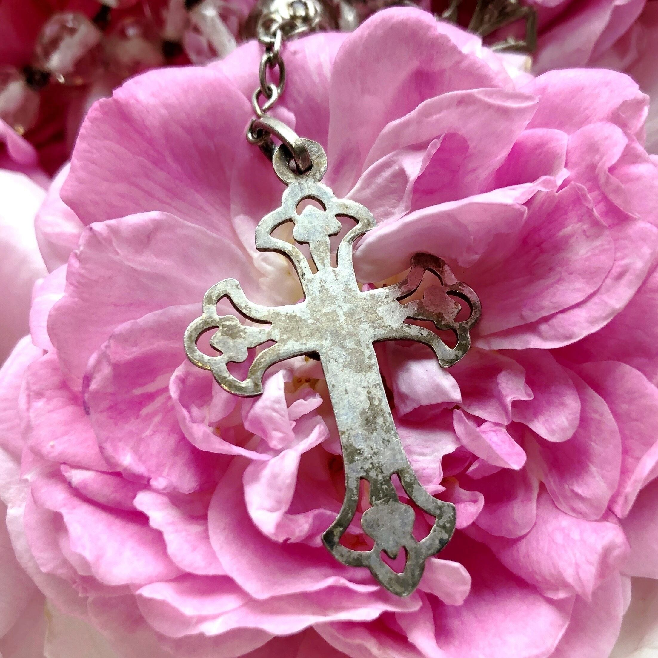 19世紀から20世紀初頭のフランス製で、クロスのサイズは約2.5×3.5センチ、クロスとチェーンを繋ぐ部分が約12センチです。