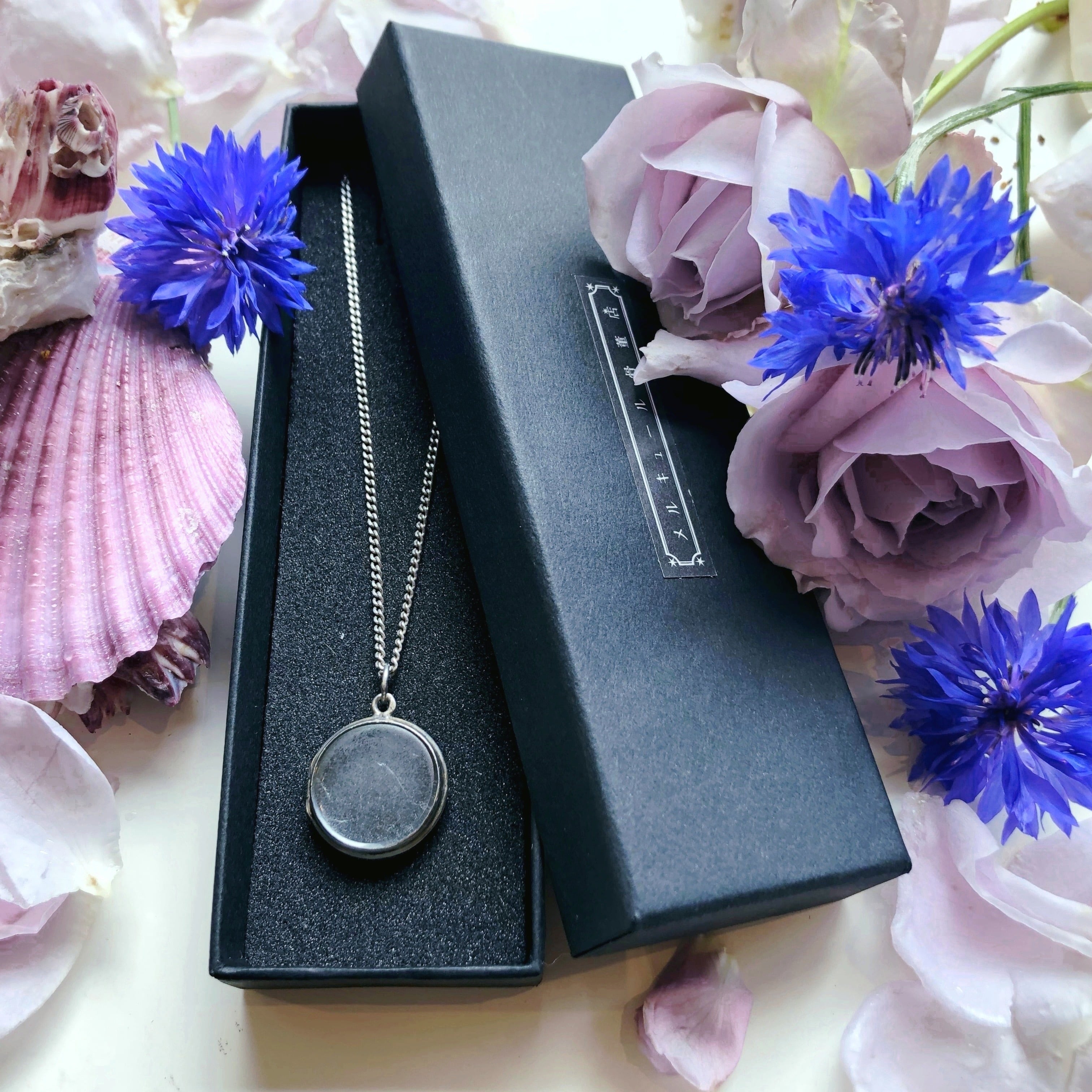 古いロケットペンダントですが、蓋は両面ともに透明な樹脂の板になっています。素材はシルバーとのことですが、ホールマークは確認されていません。ただ、このお品はチェーンもオリジナルで、全体にとてもよい感じの古色を帯びています。古びた雰囲気を漂わせるお品でこの簡素な意匠は、かえって珍しいかもしれません。