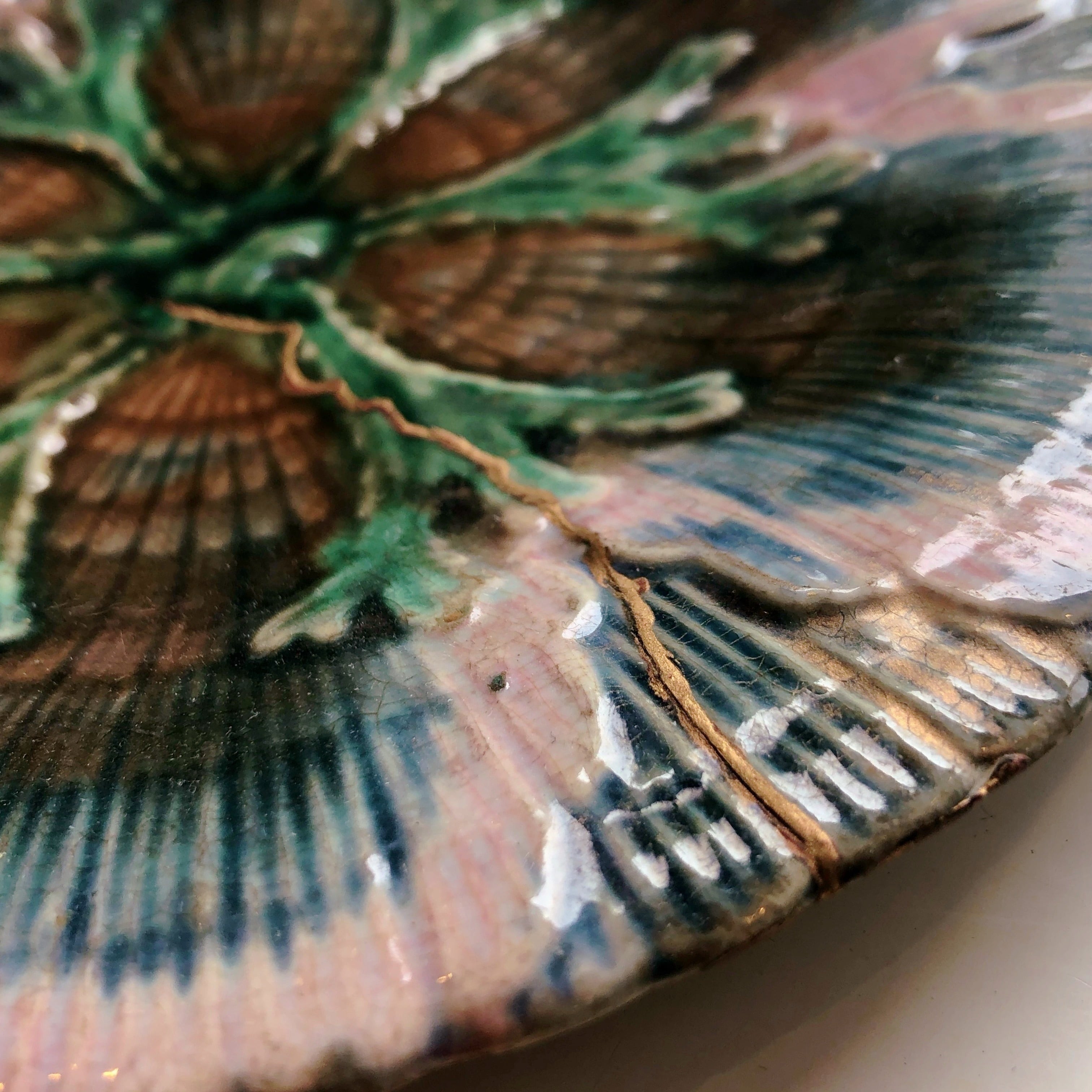 このセットが届いた時に、カップの持ち手やお皿にいくつかの損傷がありましたので、それを弊店のご近所のやまいも工房さんで、金継ぎによる修復をしていただきました。生地にはダークブルー、グリーン、ピンクなどの色彩が濃く、薄く、滲んだり濁ったりしながら踊っているのですが、そこに渋い金が置かれた景色は、もはやこのお品だけのものとなりました。
