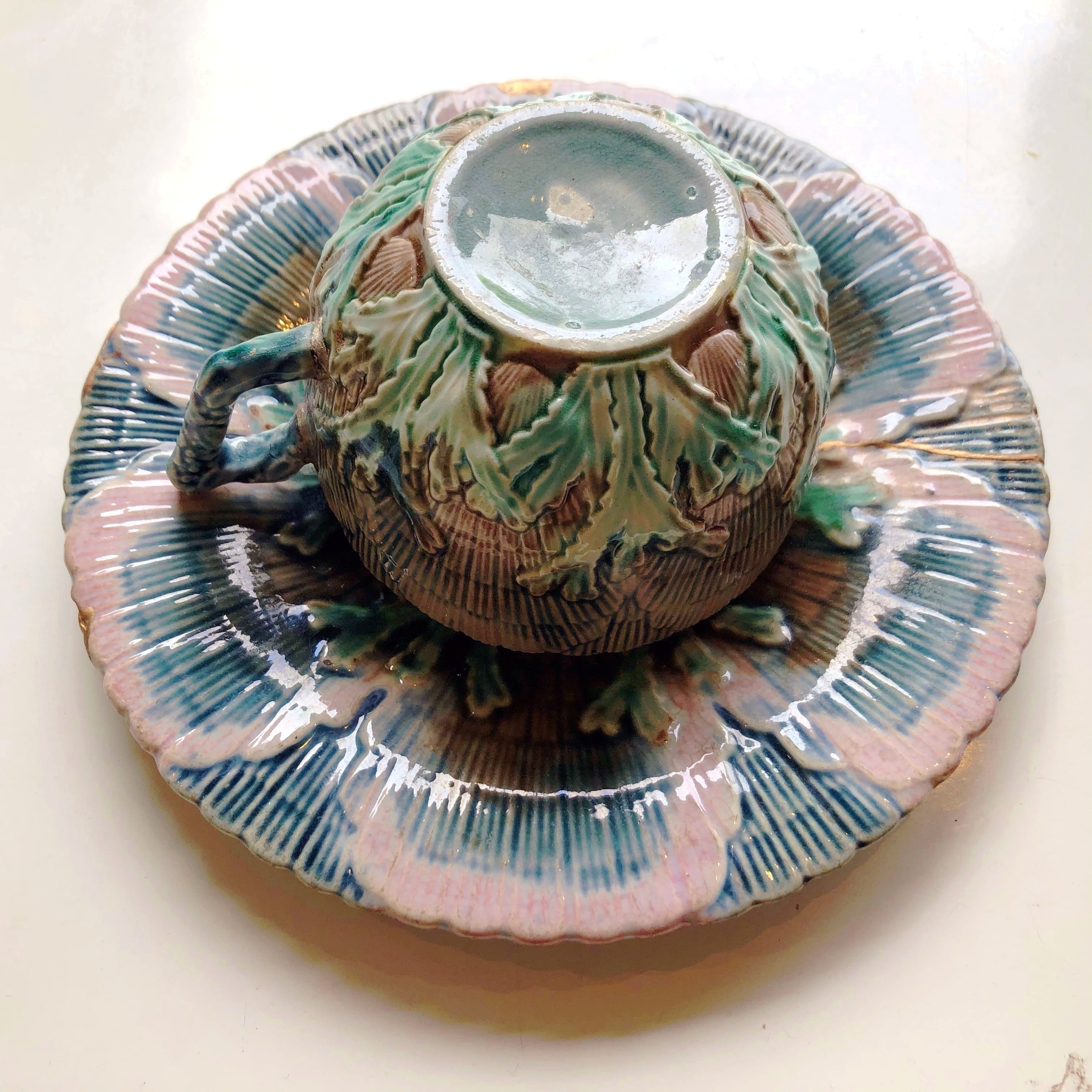 盛り上げた絵付けに彩色を施した、生命の力強さと躍動感に溢れるカップアンドソーサーです。描かれているのは海の生き物のように見えるのですが、貝とサンゴでしょうか。