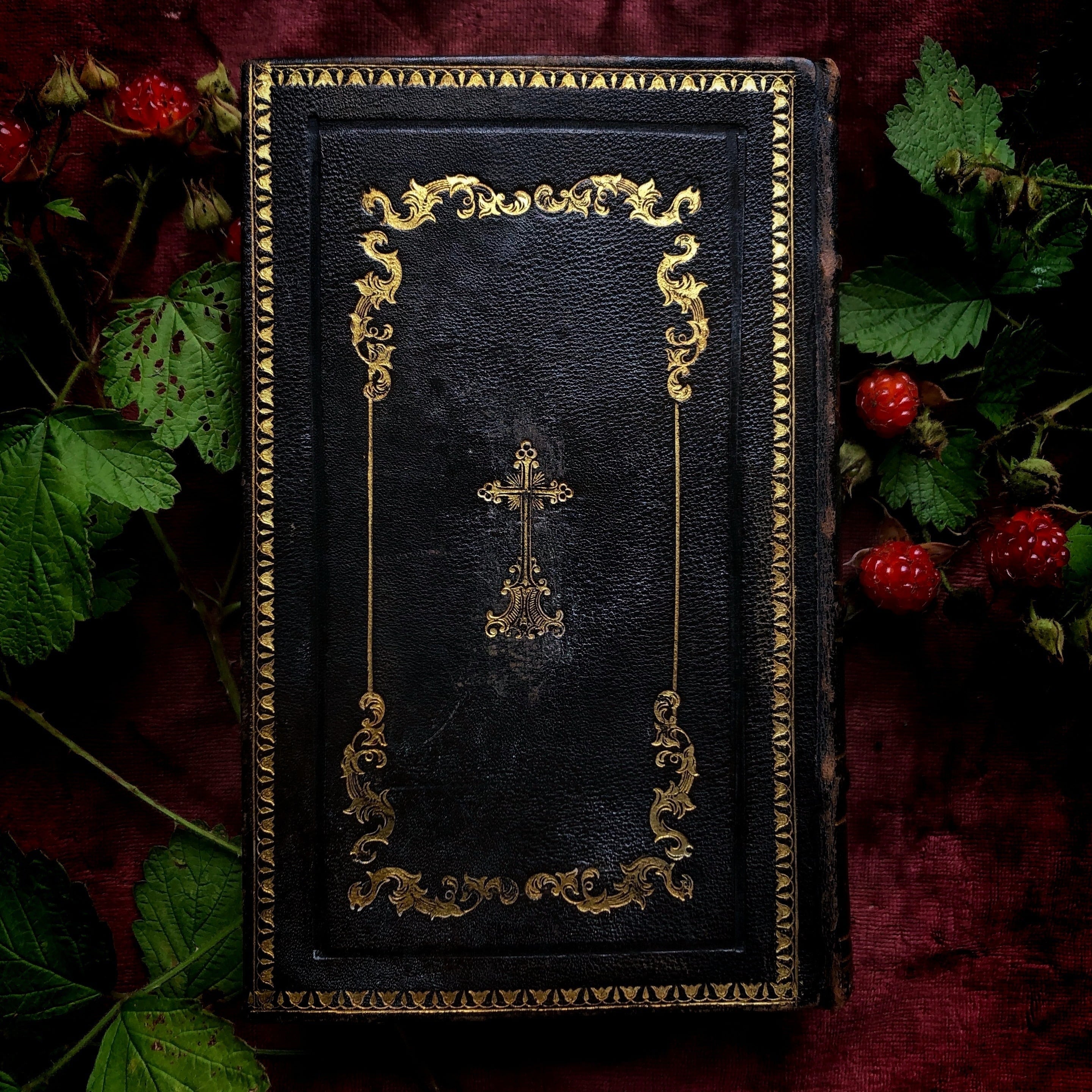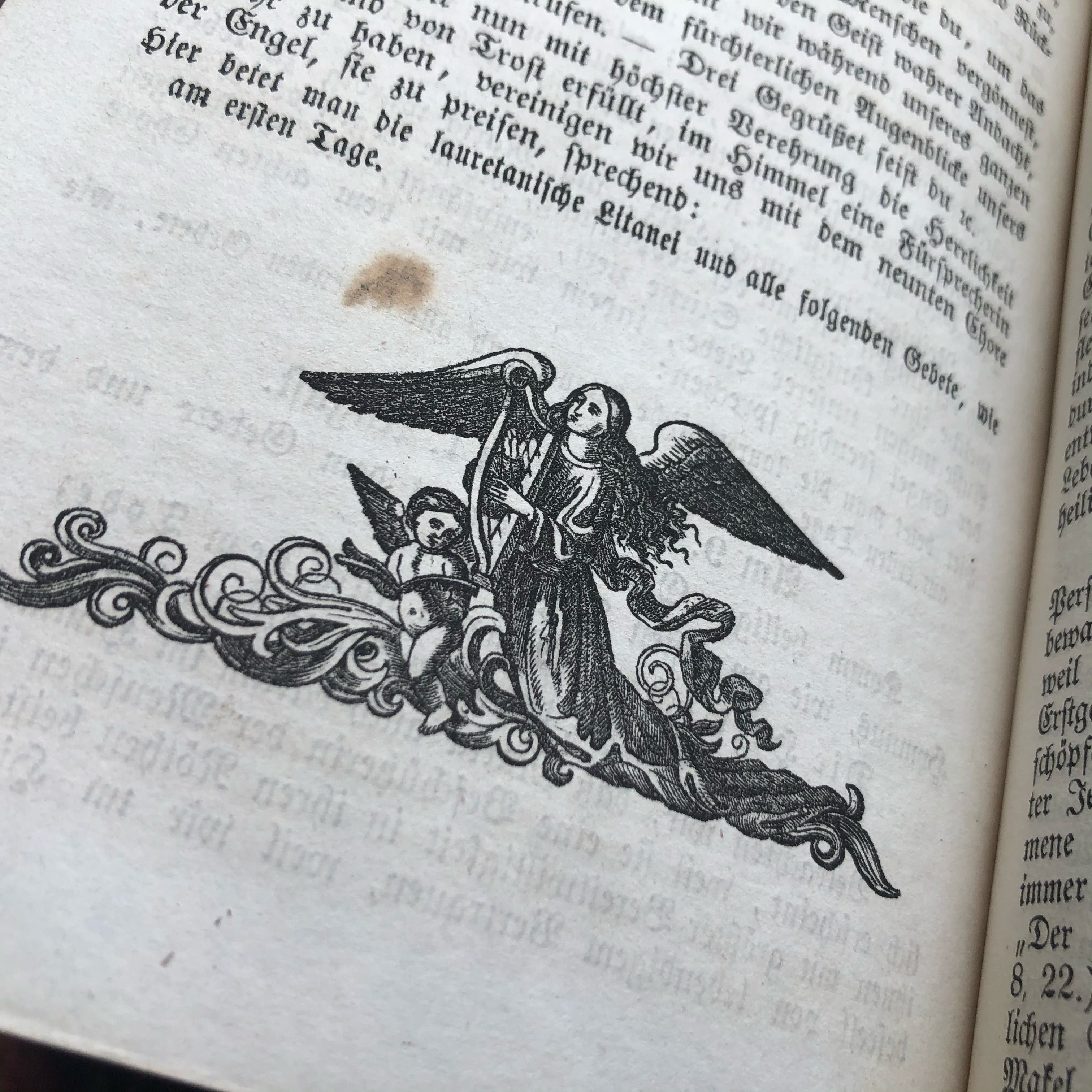 黒革にマリア様や十字架の凝った型押し、施された金色も小口の金も残っています。中には扉の迫力のある聖母子像を始め、何点もの図版が見られます。とても丁寧に造られた本であり、実際に熱心に読まれたものなのでしょう。マリア様の愛や救いについて書かれているのでしょうか。