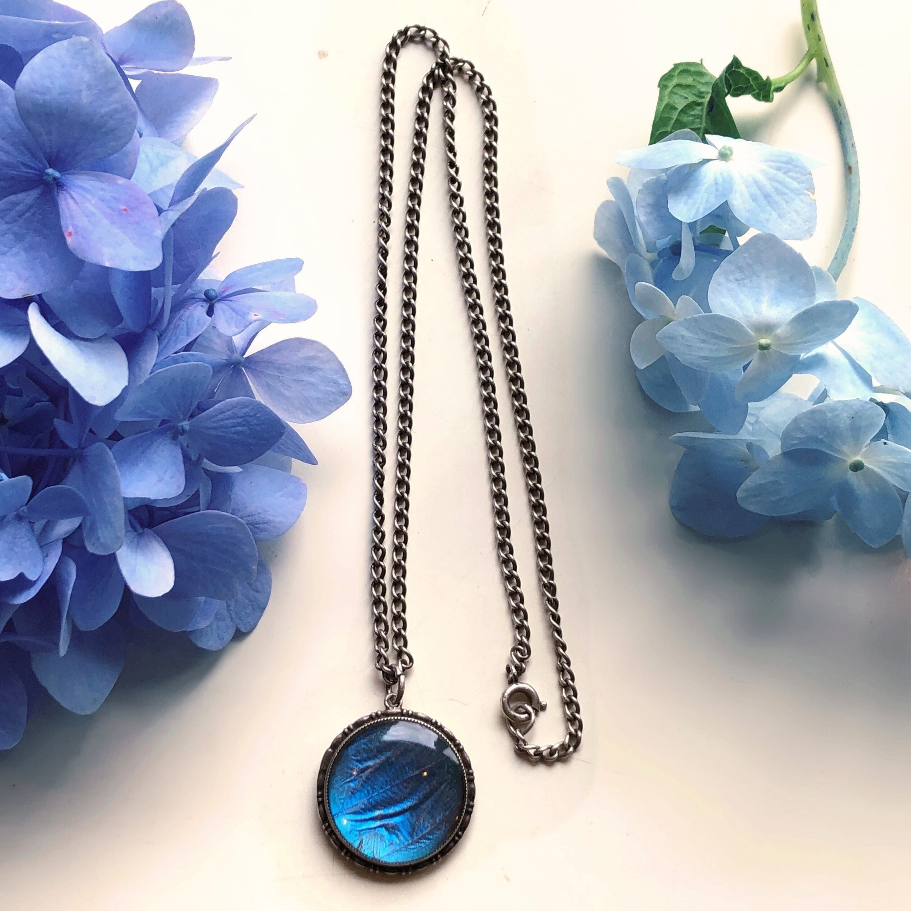 丸形のモルフォ蝶のペンダントです。アール・デコの頃にイギリスで流行したもので、本物のモルフォ蝶の羽が使われています。羽は天然のものですので、モルフォ蝶の装飾品は1点ずつ表情が違うのですが、こちらは輝く青から紫がかった濃紺まで、角度と光の具合でお楽しみいただけます。また、羽の模様が独特の立体感を生み、その筋によって全体が光沢を放つ青と濃紺に分割される瞬間もあります。